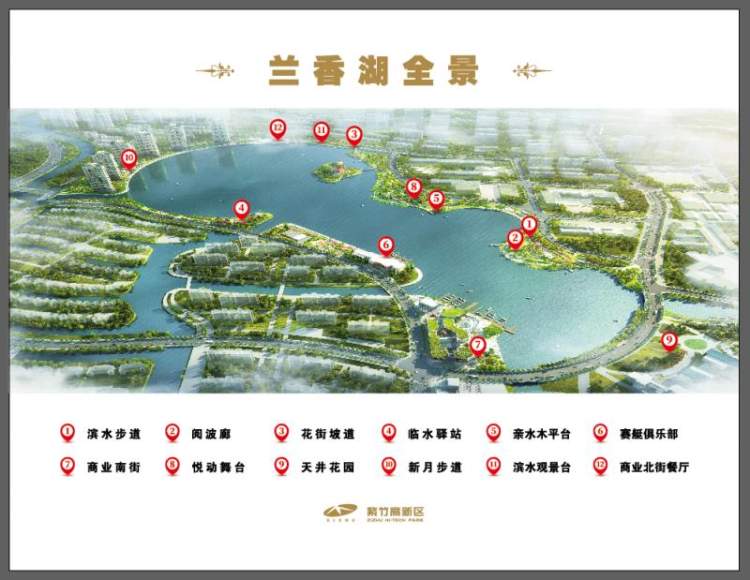 蘭香湖湖面面積近37萬平方米,開挖土方總量約為150萬立方。沿湖綠地面積共計8.3萬平方米,在近4公里的岸線上,串聯著商業街、星月步道、文化藝術長廊、賽艇俱樂部、蘭香湖親子酒店和陽光樂園、青少年活動中心等十多個景觀節點,體現了人類與自然,園區與社區、校區的有機結合。
