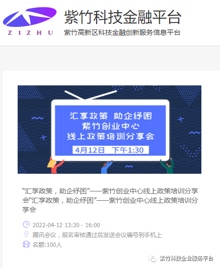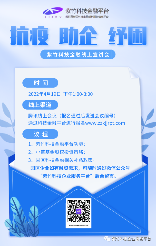 為助力園區企業渡過疫情難關,對接金融資源,了解園區特色政策,紫竹科技金融平臺特此舉辦科技金融線上宣講會。參與對象僅限紫竹高新區內企業、各部門、子公司,因此通過科技金融平臺報名并請留意審核結果。具體如下: