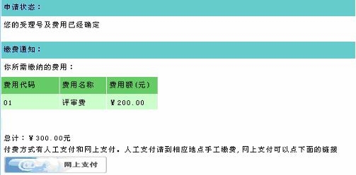 獲取受理號后,請在頁面 欄目支付評審(認證)費用。(發票可在評審結束后領取退回申報材料時領取)