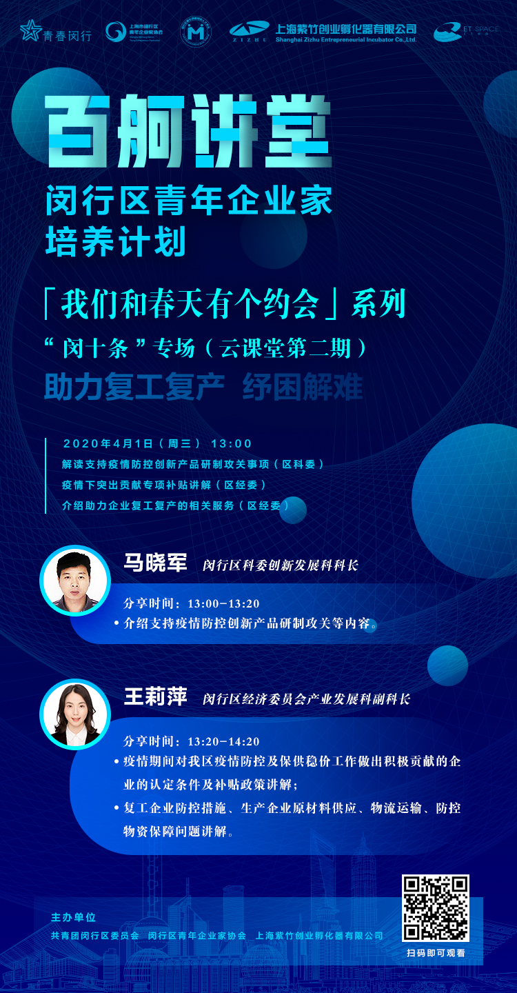 “百舸講堂”閔行區(qū)青年企業(yè)家培養(yǎng)計(jì)劃——“我們和春天有個(gè)約會(huì)”系列“閔十條”專場 (掃碼填表可回看直播內(nèi)容)