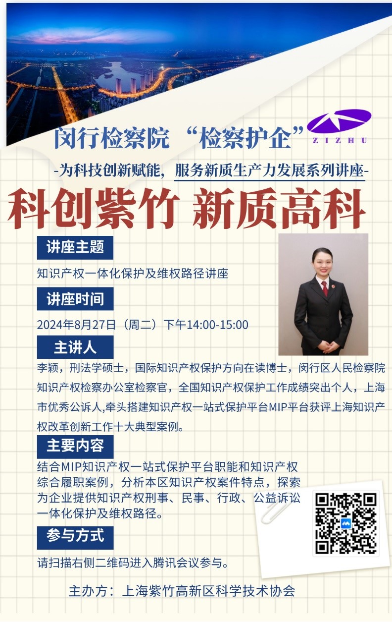 “為科技創(chuàng)新賦能,服務(wù)新質(zhì)生產(chǎn)力發(fā)展”系列講座之六,本次講座為響應(yīng)閔行區(qū)檢察院“檢察護企”活動,由紫竹高新區(qū)科協(xié)主辦,無需報名,掃碼參加即可。