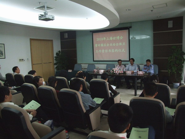 繼園區召開2010年上海世博會安保工作領導小組會議后不久,紫竹科學園區與入駐企業的世博會安全保衛責任書簽約儀式于10月13日在數碼港1號樓2樓4號會議室舉行,園區商會、城區管理公司、園區警務室及各入駐企業的代表出席了會議
