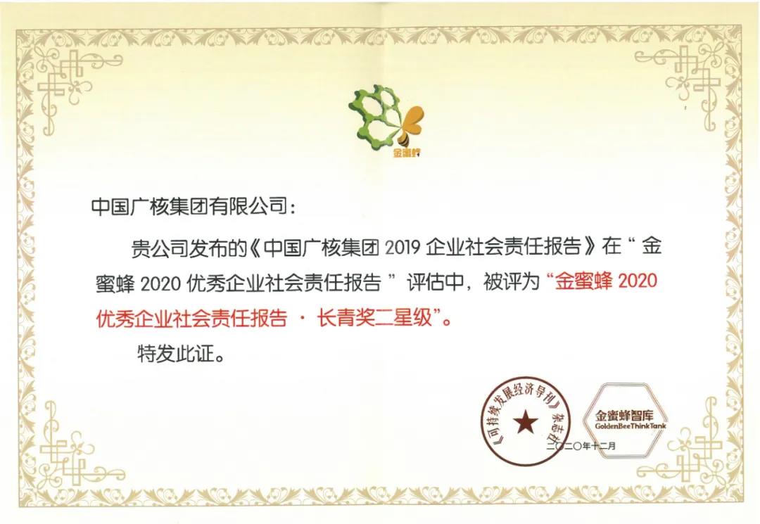 2020年12月3日,第十三屆中國企業社會責任報告國際研討會在北京召開,會上發布了“金蜜蜂2020優秀社會責任報告榜”。中國廣核集團編制的《中廣核2019社會責任報告》獲得“金蜜蜂2020優秀企業社會責任報告?長青獎”,這是中廣核連續第五年蟬聯該獎項。