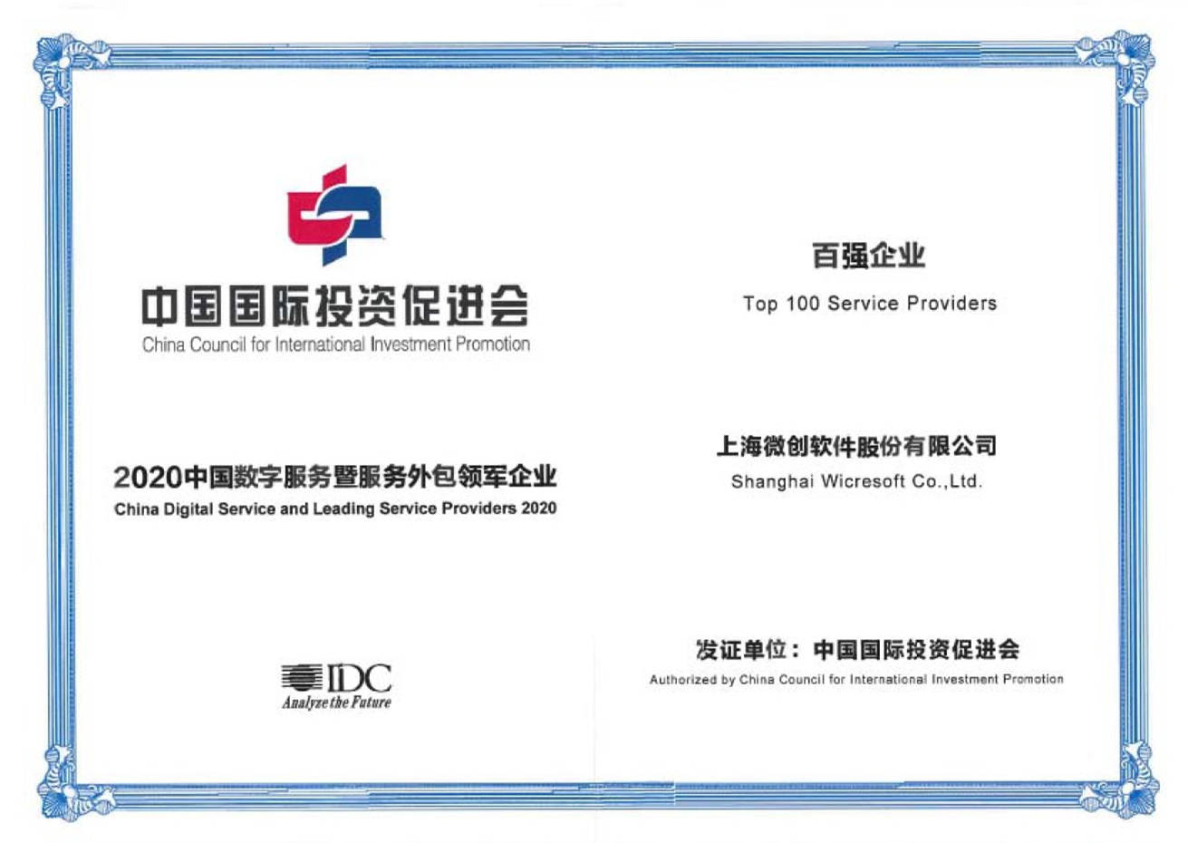 微創軟件榮獲2020中國數字服務暨服務外包領軍企業百強企業