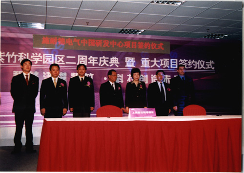 2004年6月26日,施耐德電器(中國)研發中心正式簽約入駐上海紫竹科學園區,施耐德電器(中國)研發中心總經理Mr.ClaudeGrelier與上海紫竹科學園區執行副總經理夏光先生在入駐協議上簽字