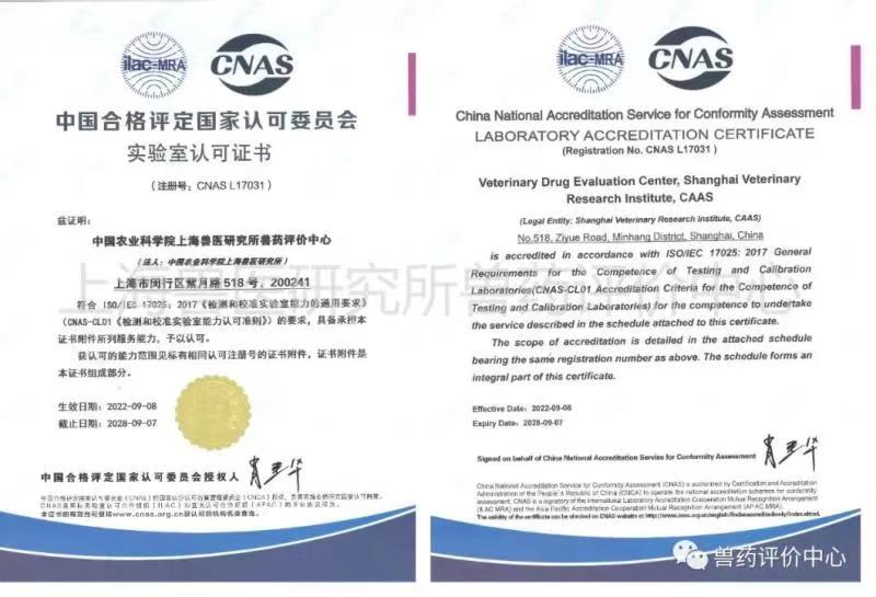 上海獸醫研究所獸藥評價中心獲得CNAS實驗室認可證書