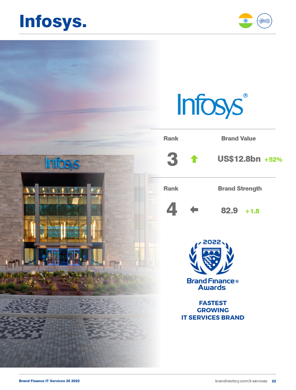 近日,印孚瑟斯被全球領先的品牌估值公司Brand Finance(英國品牌金融咨詢公司)在其《2022年全球500強》報告中評為增長最快的IT服務品牌。品牌估值見證了印孚瑟斯品牌增長的巨大飛躍,其品牌價值同比增長52%,自2020年以來增長超過80%,使其躋身全球最具價值IT服務品牌前三名。
