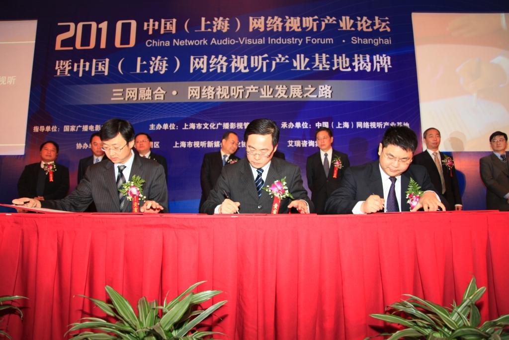 12月22日上午9時,2010中國(上海)網絡視聽產業論壇暨中國(上海)網絡視聽產業基地揭牌儀式于上海虹橋萬豪大酒店隆重舉行。上海市文廣局局長朱詠雷主持了揭牌儀式,國家廣電總局副局長田進,上海市委常委、副市長屠光紹和上海市委常委、宣傳部部長楊振武共同為中國(上海)網絡視聽產業基地揭牌,宣布基地正式成立。出席揭牌儀式的還包括國家廣電總局、市委市政府、上海市文廣局、上海紫竹科學園區及上海市其他相關部門領導等。