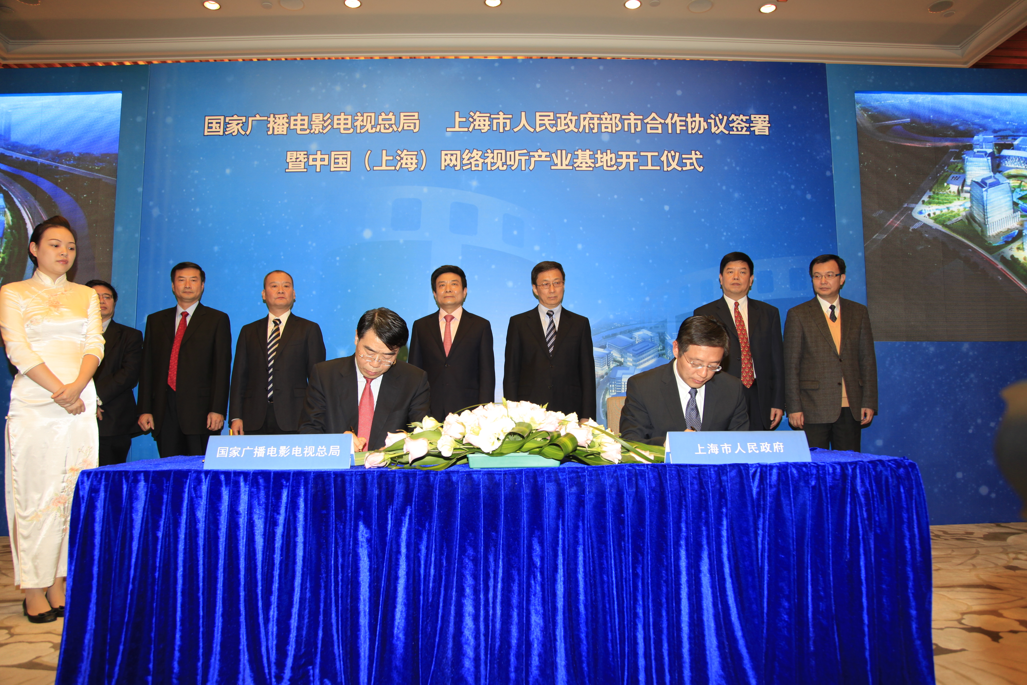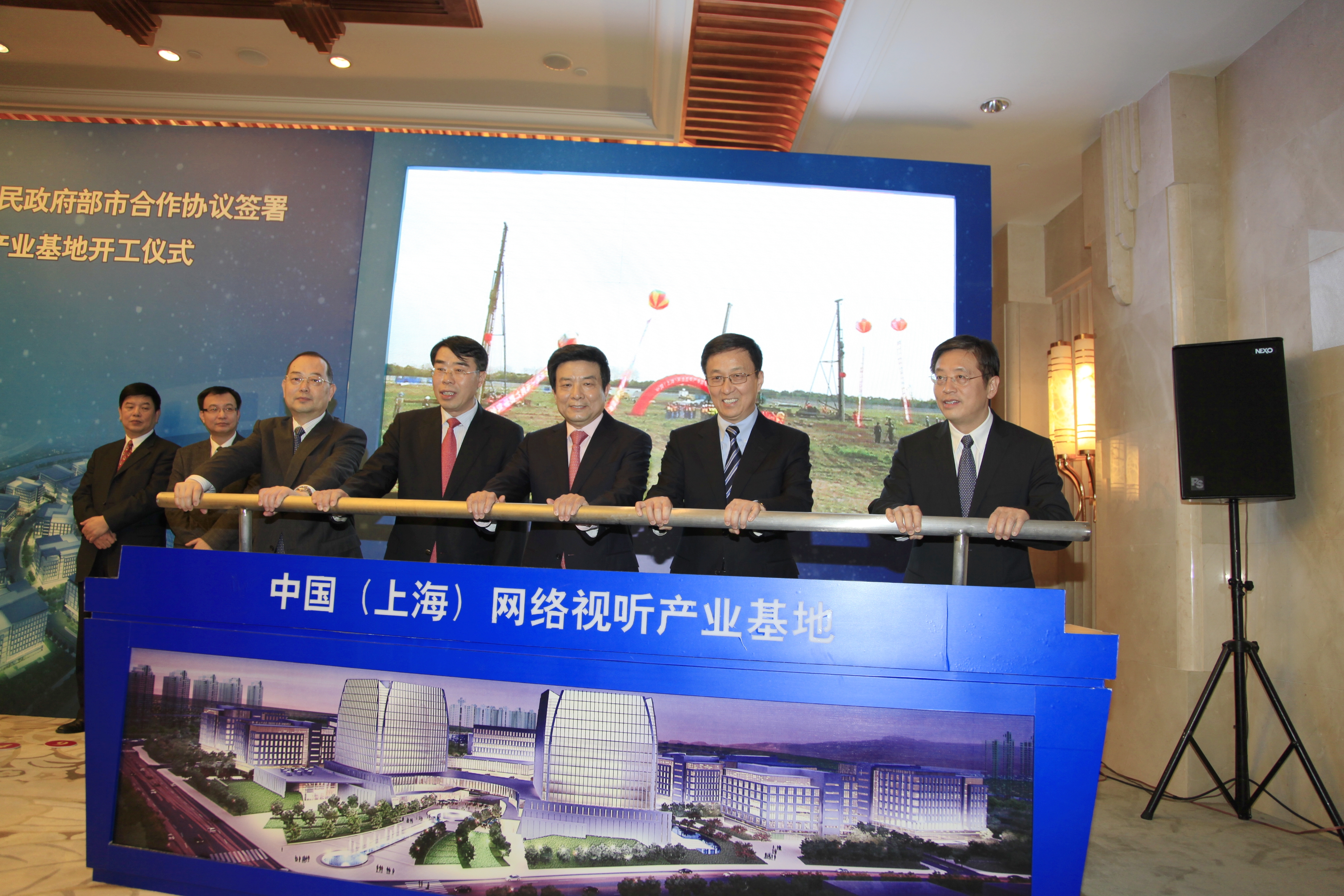 12月1日,國家廣播電影電視總局與上海市人民政府部市合作協(xié)議簽署暨中國(上海)網(wǎng)絡(luò)視聽產(chǎn)業(yè)基地開工儀式在滬舉行。中宣部副部長、國家廣電總局黨組書記、局長蔡赴朝,上海市委副書記、市長韓正出席儀式并講話。國家廣電總局副局長田進,上海市委常委、副市長屠光紹分別代表國家廣電總局和上海市政府簽署部市合作協(xié)議,上海市委常委、宣傳部長楊振武主持儀式。