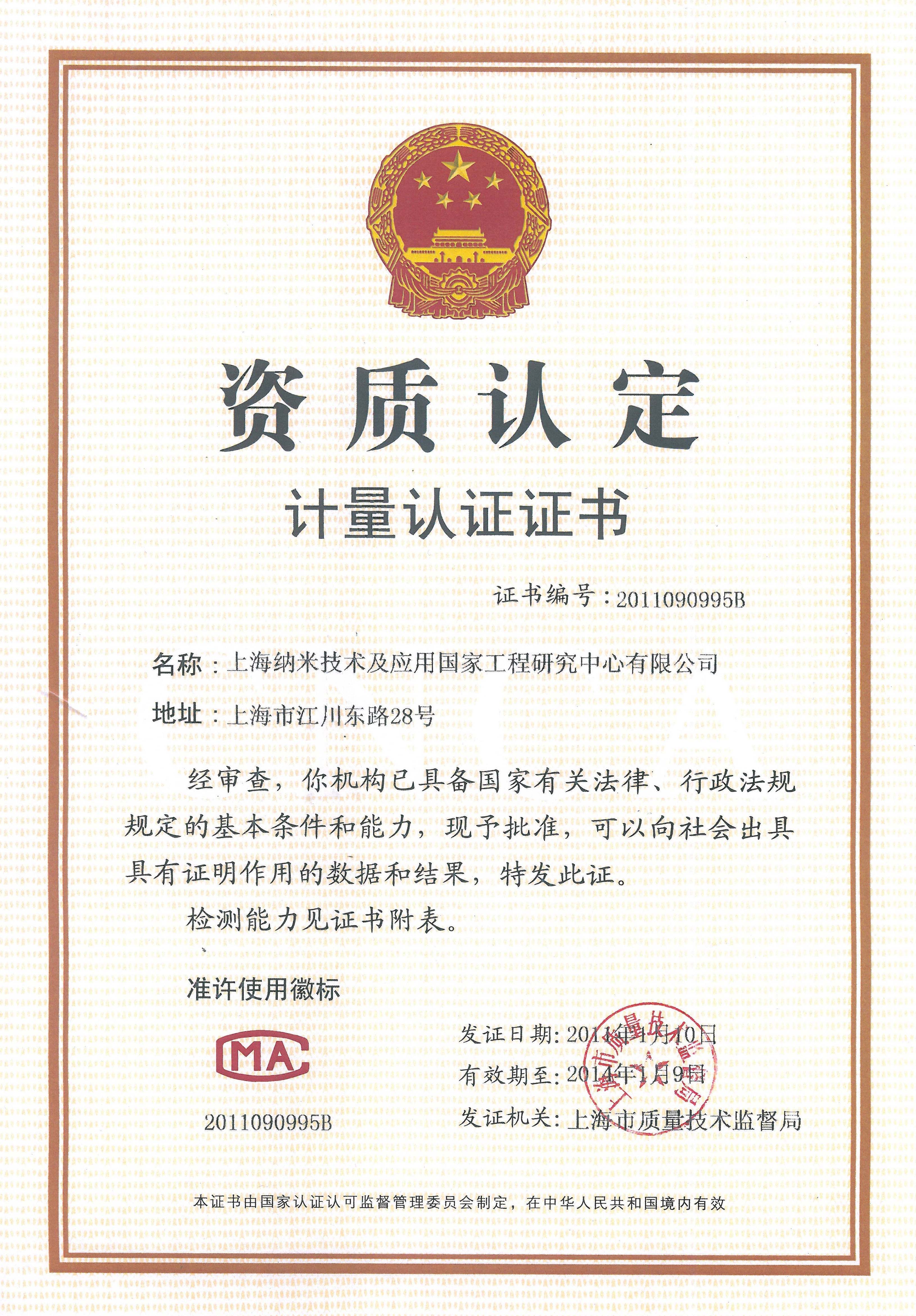 納米技術及應用國家工程研究中心于2011年1月獲得了由上海市質量技術監督局頒發的實驗室資質認定計量認證證書,這標志著中心實驗室已具備國家有關法律、行政法規規定的基本條件和能力,可獨立實施相關檢測,獲得了向社會出具公信數據的法定資質。這是中心邁向實驗室規范管理建設的第一步。