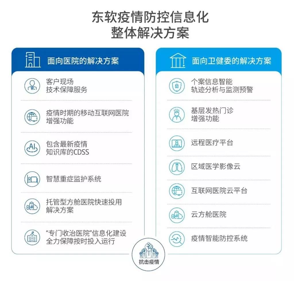 針對疫情期間醫院需求,東軟為醫院提供從客戶現場技術保障服務、疫情時期的移動互聯網醫院增強功能、包含最新疫情知識庫的CDSS、智慧重癥監護系統、托管型方艙醫院快速投用、“專門收治醫院”信息化建設等六個行業領先的解決方案;面向各級衛健委,東軟提供個案信息智能軌跡分析與監測預警、基層發熱門診增強功能、遠程醫療平臺、區域醫學影像云、互聯網醫院云平臺、云方艙醫院、疫情智能防控系統等七個行業領先的解決方案。