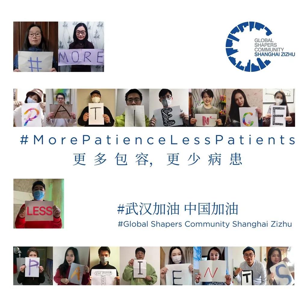 在新冠病毒嚴峻的疫情形勢下,2月14日,紫竹社區集結近20位社區杰青與志愿者,每人作為一個“字母”,喊出了“更多包容,更少病患”(More Patience Less Patients)的口號,為中國加油。