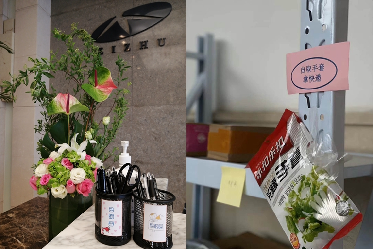 前臺配置的兩個筆筒,一個“已消毒”,一個“已使用”,盡力做到一人一筆,用后統一消毒;同時配備一次性手套方便員工取快遞,減少交叉感染機率。