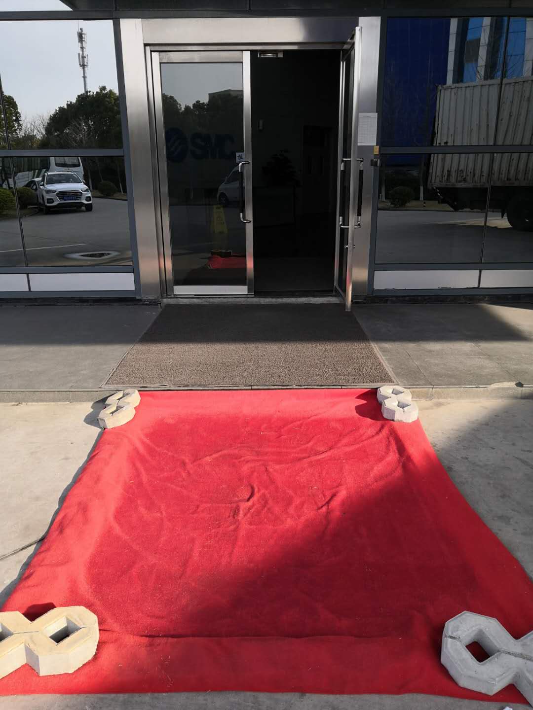 鞋底消毒區,簡單的框架,鋪上紅地毯,每天噴灑消毒水,給進公司的同事鞋底消毒,起到防止傳播感染作用。
