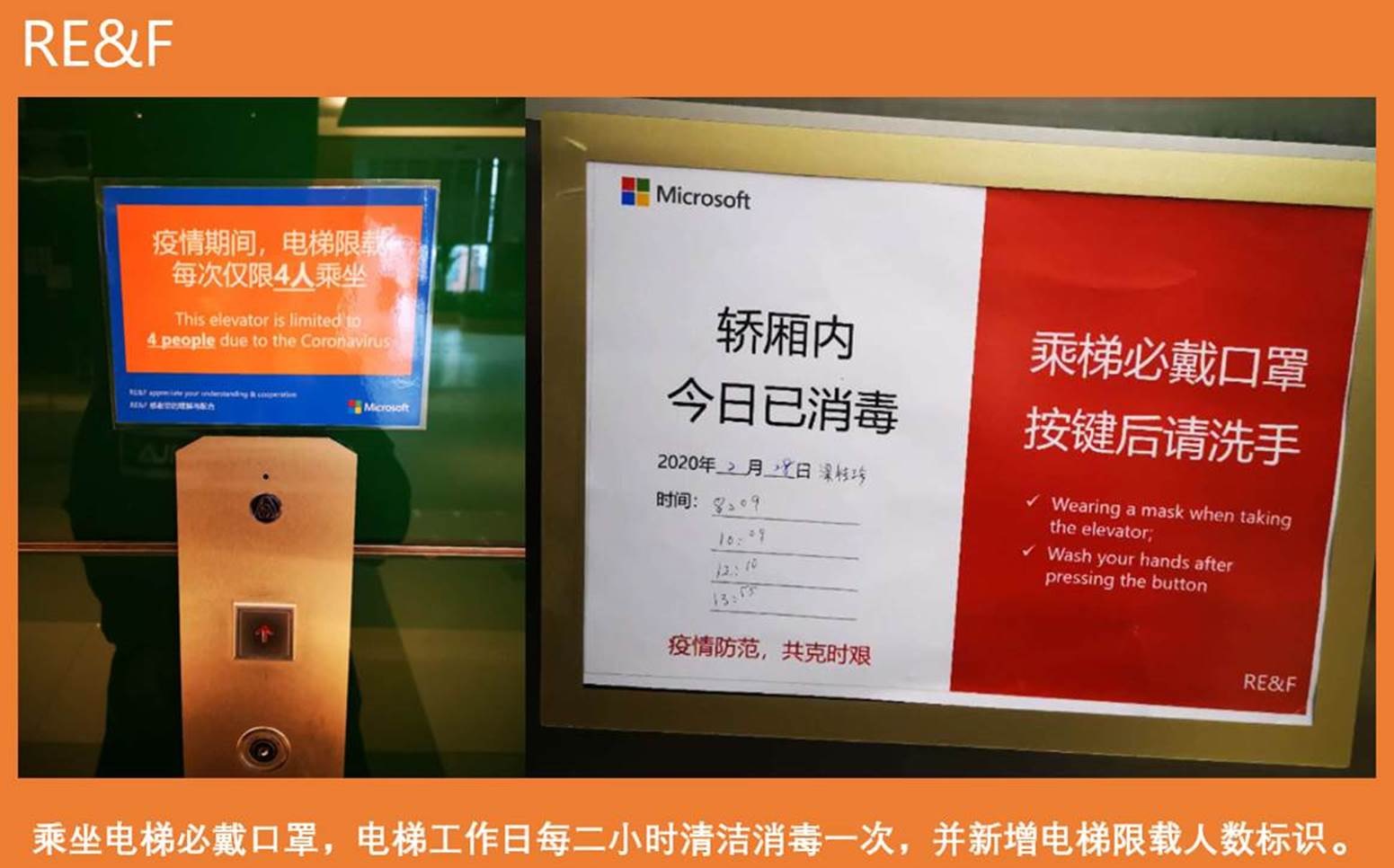 乘坐電梯必戴口罩,每個電梯限載人數為4人,電梯每兩個小時消毒一次。