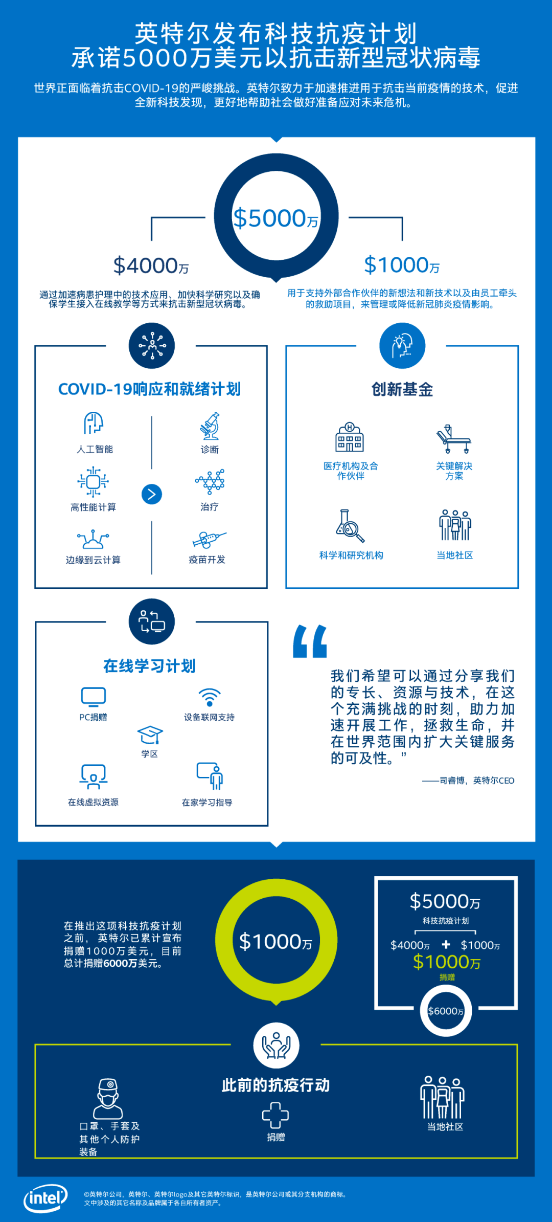 英特爾CEO司睿博(BobSwan)表示:“世界正面臨著抗擊COVID-19的嚴峻挑戰。英特爾致力于加速推進用于抗擊當前疫情的技術,促進全新科技發現,更好地幫助社會做好準備應對未來危機。我們希望可以通過分享我們的專長、資源與技術,在這個充滿挑戰的時刻,助力加速開展工作,拯救生命,并在世界范圍內擴大關鍵服務的可及性。”
