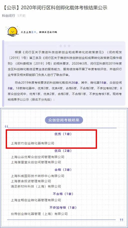 2020年4月8日,2019年閔行區眾創空間考核結果正式公布,紫竹創業孵化器連續第四年以優異的成績榮登閔行區眾創空間考核(眾創空間組)第一名,成為全區眾創空間科創服務工作標桿孵化器。