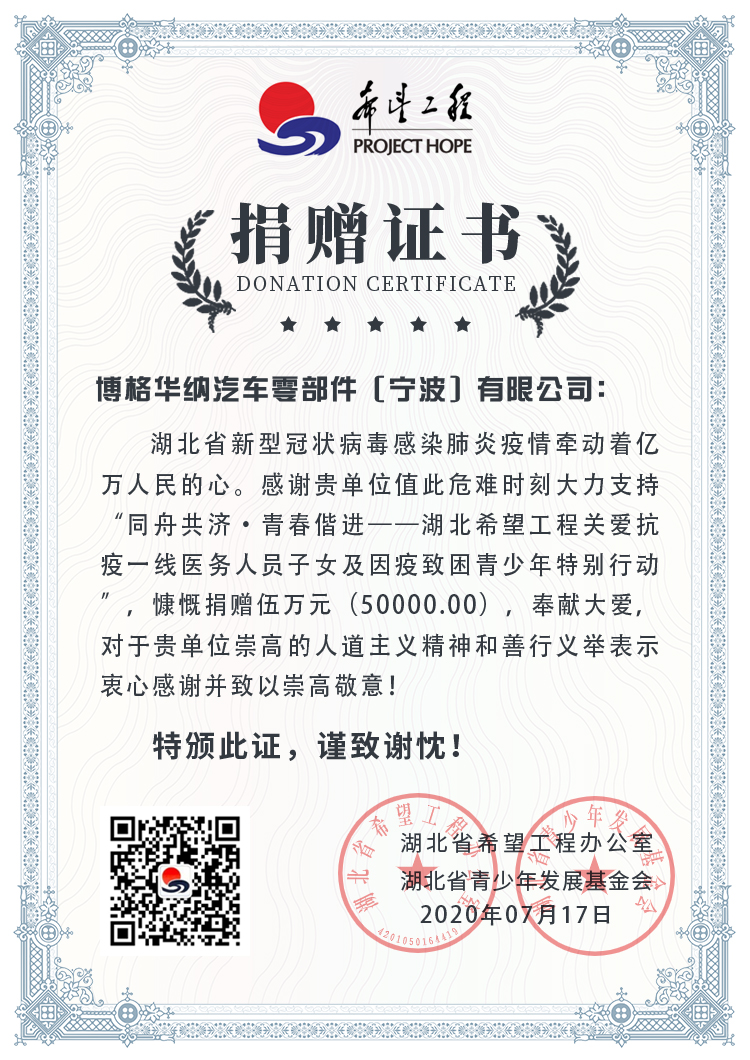 抗擊疫情,愛在身邊,為貫徹落實習近平總書記重要指示精神,響應團中央的號召,紫竹高新區入駐企業博格華納的變速器事業部在共青團上海市委、上海市希望工程辦公室和紫竹高新區團委的幫助下,積極參與支持湖北省希望工程辦公室、湖北省青少年發展基金會開展“同舟共濟青春偕進——湖北希望工程關愛抗疫一線醫務人員子女及因疫致困青少年特別行動”,捐贈5萬元人民幣用于幫助抗疫一線醫務人員子女解決實際困難、順利完成學業,傳遞了非公企業的愛心和溫暖。