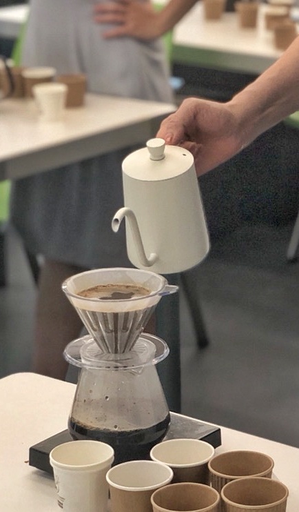 活動中,咖啡師介紹了手沖咖啡與機磨咖啡的區別,并且邀請大家品嘗了不同風味的手沖咖啡。隨后,大家按照咖啡師的指導一步步親自制作了手沖咖啡。經過稱量、研磨、濕紙、倒粉、注水、滴濾和出杯等工序,一杯杯香濃可口的咖啡被制作出來,教室里彌漫著陣陣咖啡香味。近2個小時的實踐,大家了解咖啡知識并親手制作手沖咖啡,均表示收獲滿滿。