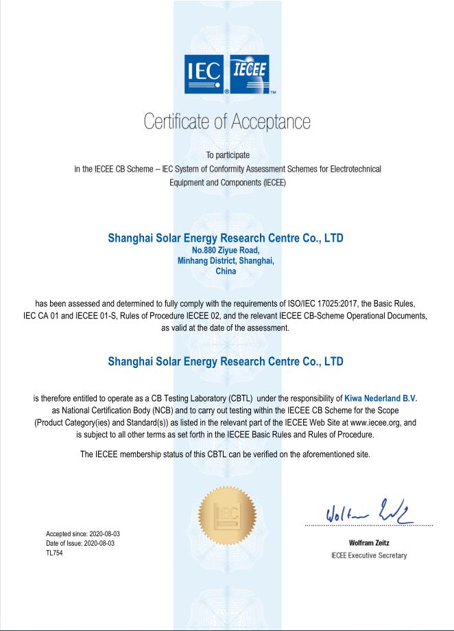 近日,國際電工委員會電工產品合格測試與認證組織(IECEE)向上海太陽能工程技術研究中心頒發CBTL證書,標志著公司檢測實驗室在人員、設備、測試方法、環境條件、管理體系等方面已全部符合IECEE相關要求,可以開展相關測試項目的認證工作。