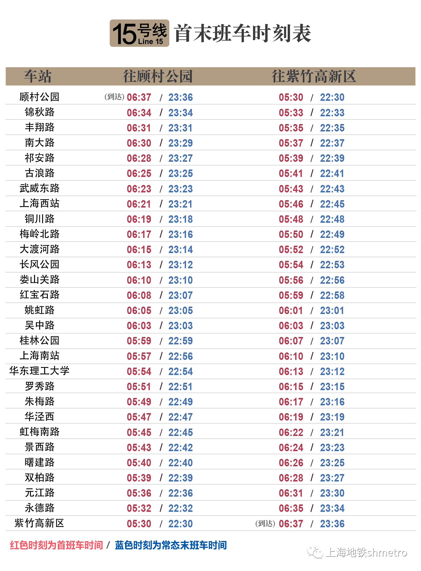15號線開通運營后,全線常態運營時間為5:30至23:36。紫竹高新區站及顧村公園站首班車發車時間均為5:30,末班車發車時間均為22:30。15號線打通了紫竹高新區北往的交通大動脈,也為高新區加速建設一座創新驅動、功能完備、要素集聚、產城融合的科技城夯實了扎實的基礎。