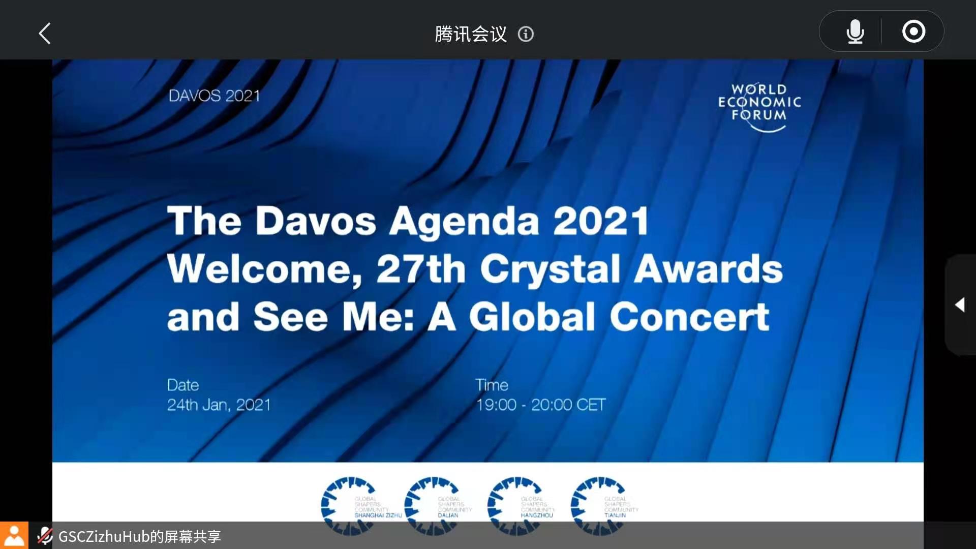 2021年1月24日,“達沃斯議程”對話會歡迎儀式和第27屆水晶獎典禮開啟。世界經濟論壇創始人兼執行主席克勞斯·施瓦布發表歡迎致辭,瑞士聯邦主席蓋伊·帕爾莫蘭發表特別致辭。世界經濟論壇全球杰出青年社區上海紫竹社區、大連社區、杭州社區、天津社區聯合舉辦線上觀摩與分享會,通過國內外互聯網平臺共同觀摩會議,并積極交流分享,針對本次為期5天的達沃斯論壇對話內容進行線上分享。