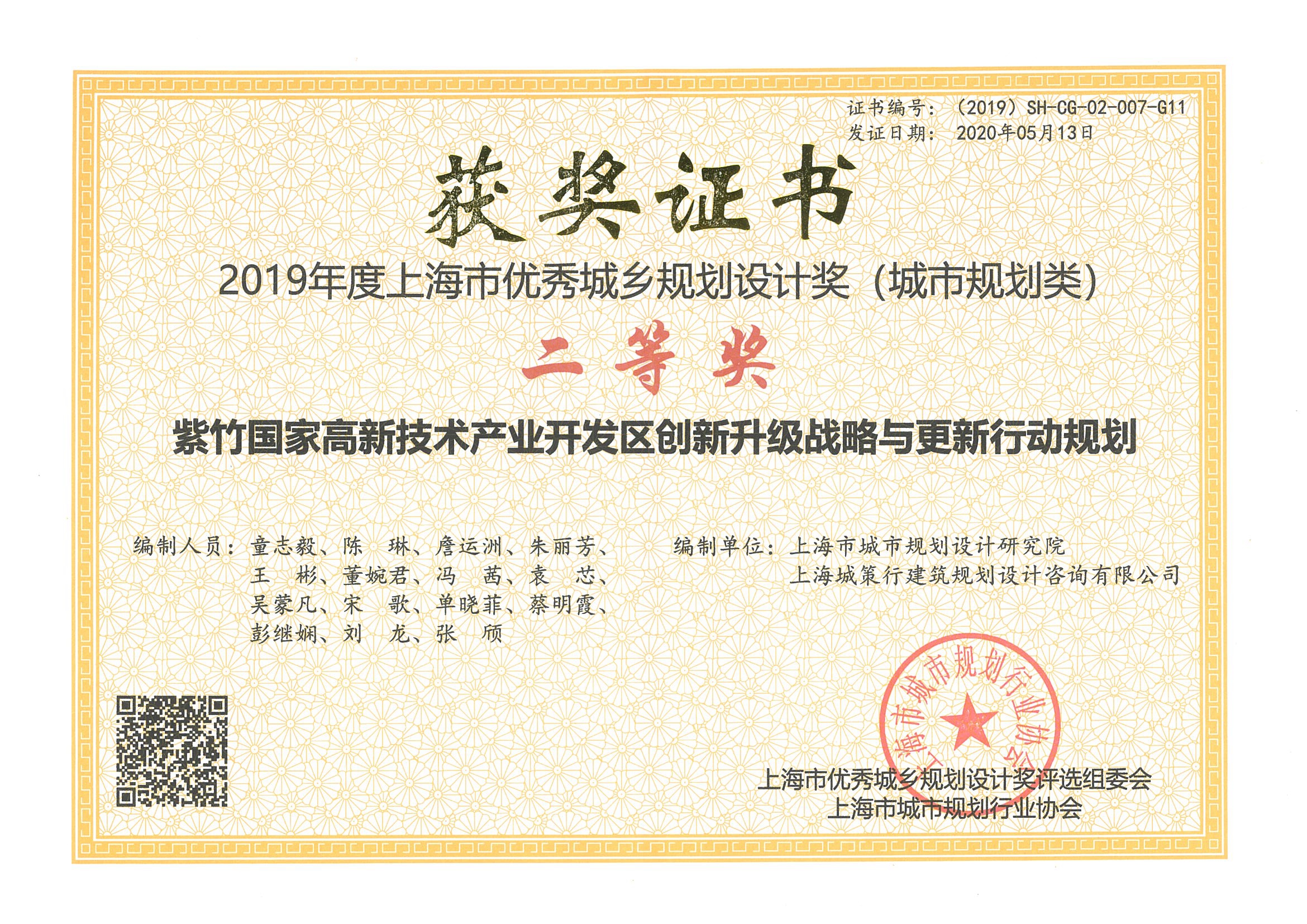 由于整個紫竹高新區規劃對標高質量發展、高品質生活和高水平治理要求,以創新力和行動力謀未來,因此經過專家考核和層層選拔,一舉榮獲2019年度上海市優秀城鄉規劃設計(城市規劃類)二等獎、國家優秀城市規劃設計獎三等獎。