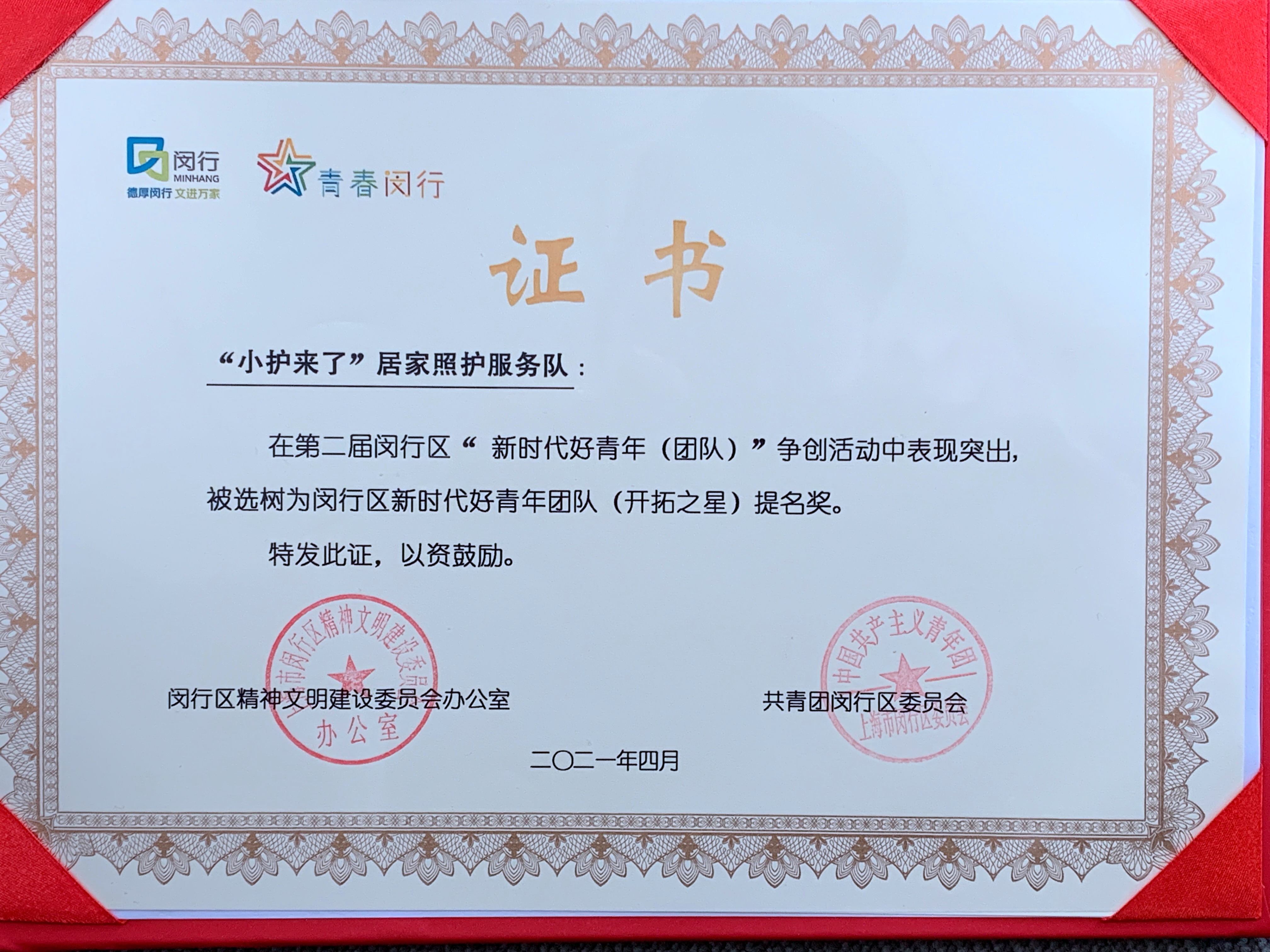 2020-2021年,閔行區(qū)文明辦、團閔行區(qū)委開展了第二屆“新時代好青年(團隊)”典型選樹活動,紫竹孵化器企業(yè)上海小護來了信息科技公司以其“居家照護服務(wù)”獲“閔行區(qū)新時代好青年”(提名獎)榮譽。在團閔行區(qū)委舉行的“初心百年·青春心向黨”主題活動上,區(qū)領(lǐng)導(dǎo)為獲獎團隊頒獎。