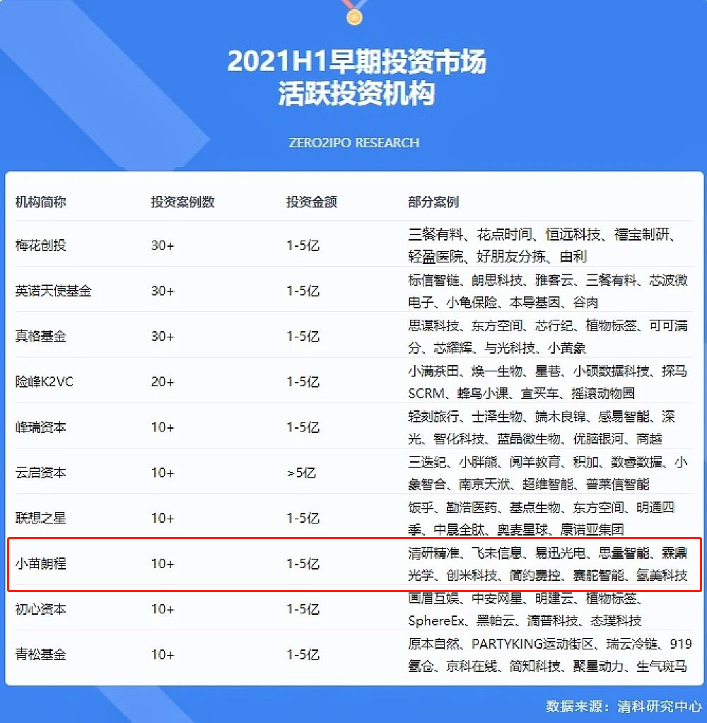 2021年8月10日,清科研究中心發布《2021年上半年活躍VC/PE名單》,小苗朗程入選“2021H1早期投資市場活躍投資機構TOP10”。