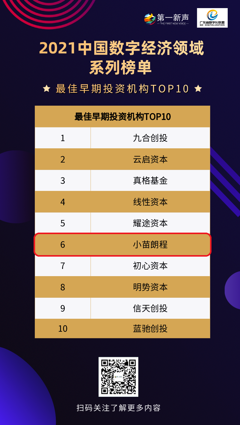 小苗朗程作為唯一一家同時榮登早期投資機構、企業服務領域和先進制造領域三大榜單的投資機構,印鑒了公司長期聚焦于投資以ABCII以及硬科技、前沿技術領域的中早期科技企業投資的決心與恒心。