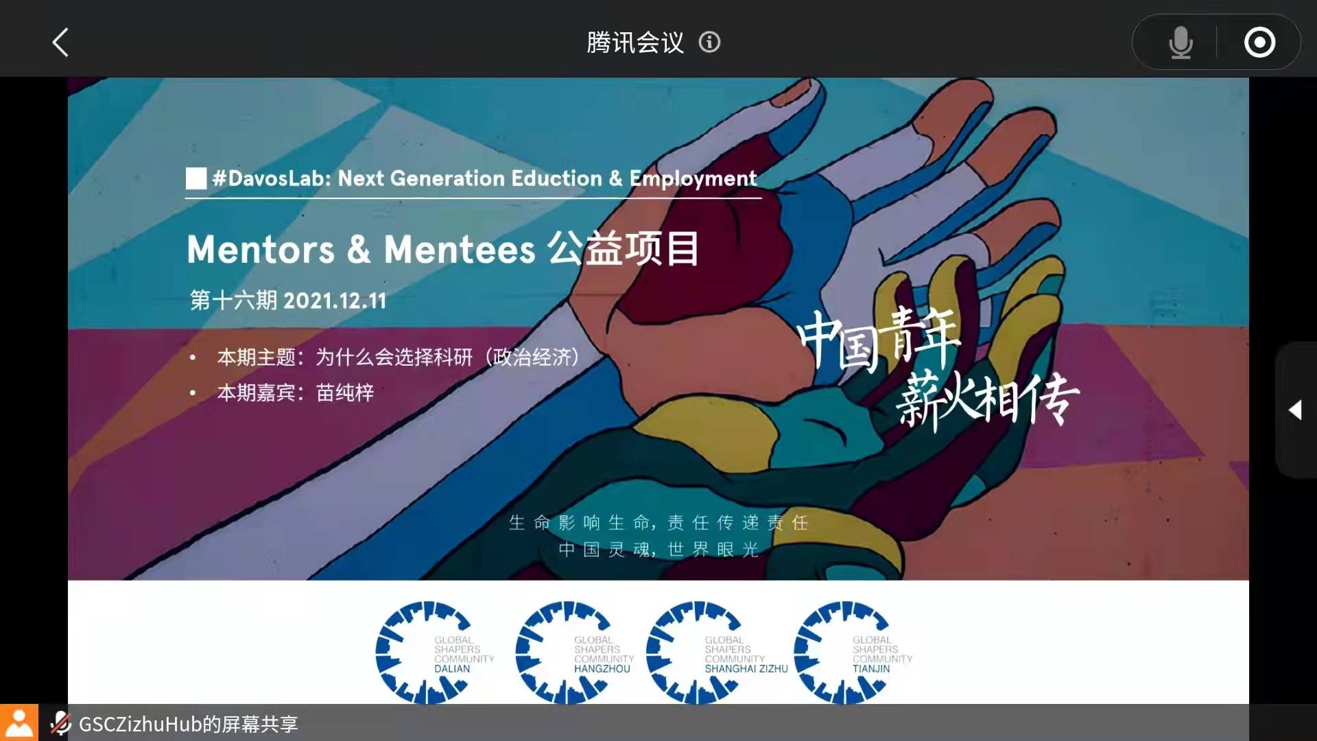 2021年12月11日,全球杰出青年社區-上海紫竹社區、大連社區、天津社區、杭州社區聯合舉辦的Mentors&Mentees 公益項目(中國青年 薪火相傳)十六期,也是本年度該活動最后一期公益分享如約在線上和廣大高校同學見面。