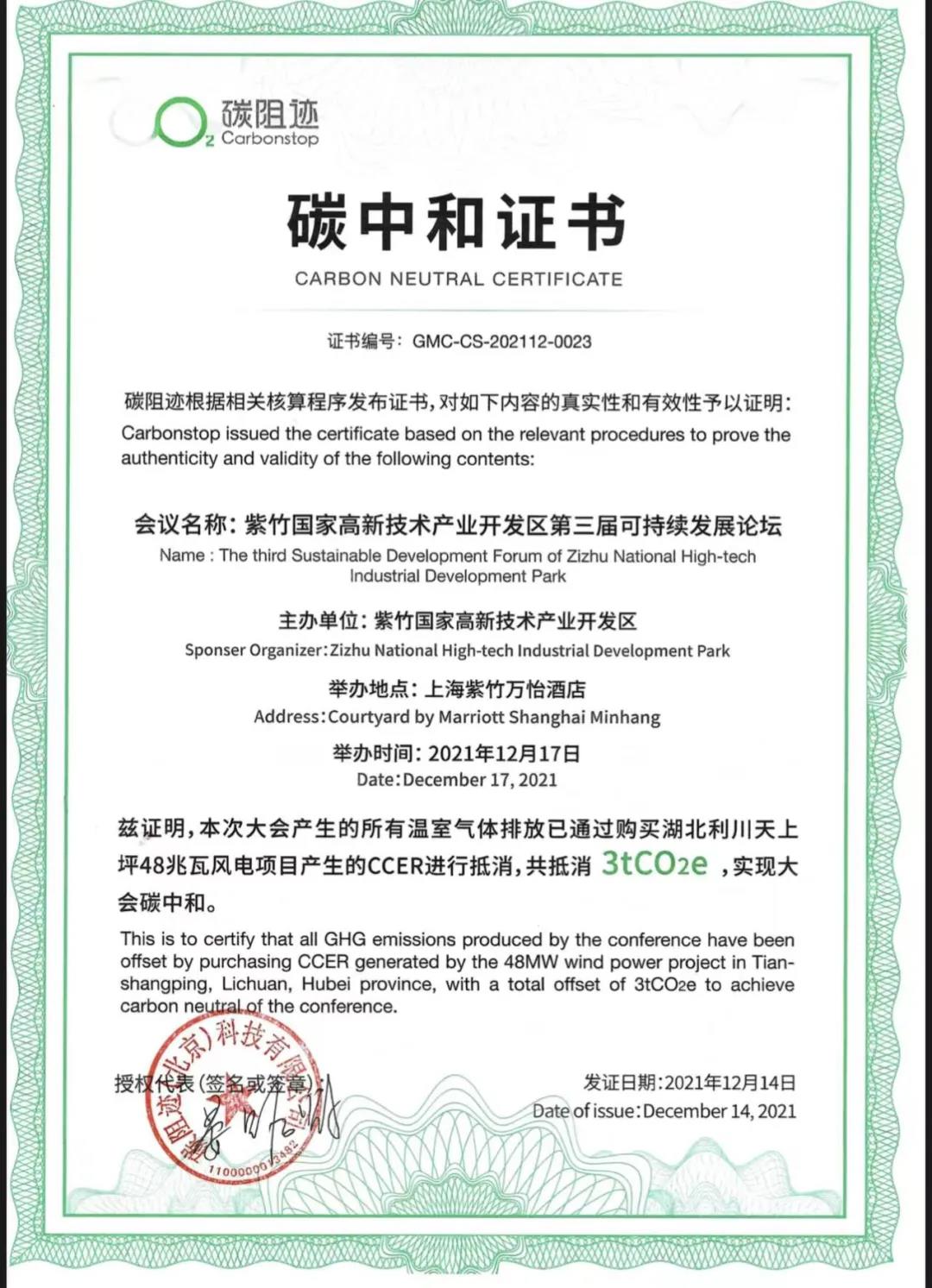 最后,碳阻跡創始人、CEO晏路輝通過視頻方式宣布本次論壇為“零碳會議”。他表示,論壇期間的電力,與會嘉賓的交通、餐飲、住宿,以及會場布置、垃圾處理等所產生的碳排放共2.58噸,通過購買CCER共抵消3噸,實現了本次論壇的碳中和。