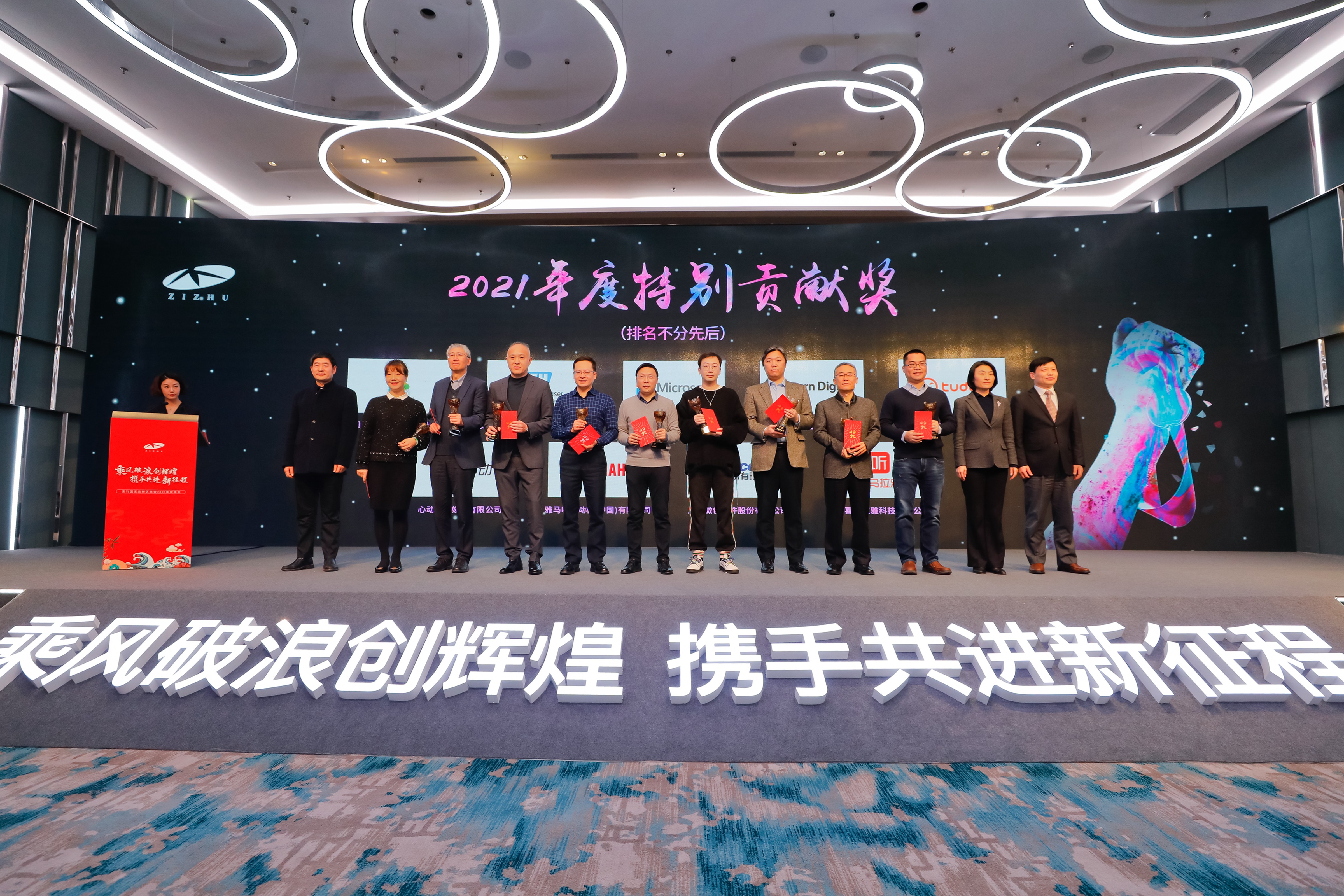 閔行區經委黨委書記、主任李慧、閔行區稅務局黨委書記、局長陸友清和吳涇鎮黨委書記金海民共同為獲得“特別貢獻獎”的企業頒獎。