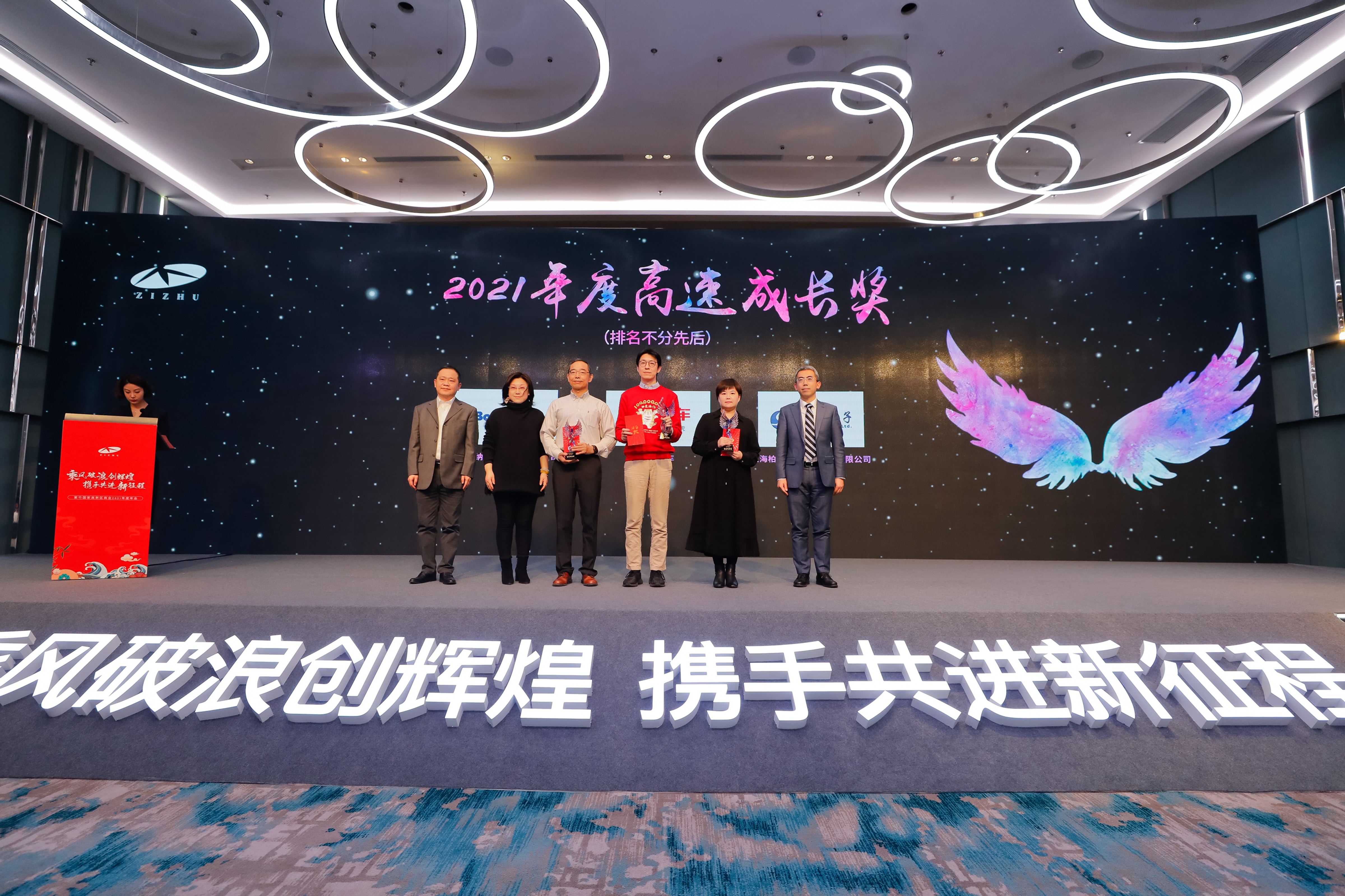 閔行區財政局黨組書記、局長李駿、莘莊海關關長邱海瀅和吳涇鎮黨委副書記、鎮長王學政為獲得“高速成長獎”的企業頒獎。