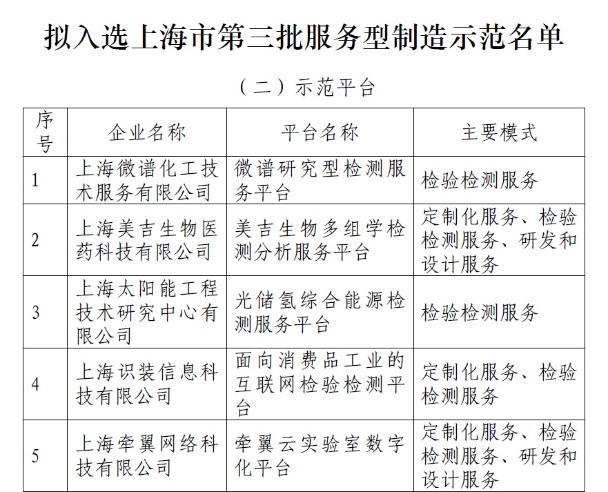 近日,經上海市經濟信息委員會組織專家評審遴選,上海市服務型制造示范(第三批)名單出爐。上海太陽能工程技術研究中心有限公司《光儲氫綜合能源檢測服務平臺》獲批“示范平臺”類項目立項。作為上海太陽能光伏技術創新服務平臺逾十年的依托單位,此次入選服務型制造示范平臺,良好展示了公司緊扣打造高端服務業發展目標,提升科技服務能力的責任擔當與成績作為,進一步促進了服務業與制造業的融合發展,也將為實踐區域檢驗檢測行業發展探索與定位導航發揮有益作用。