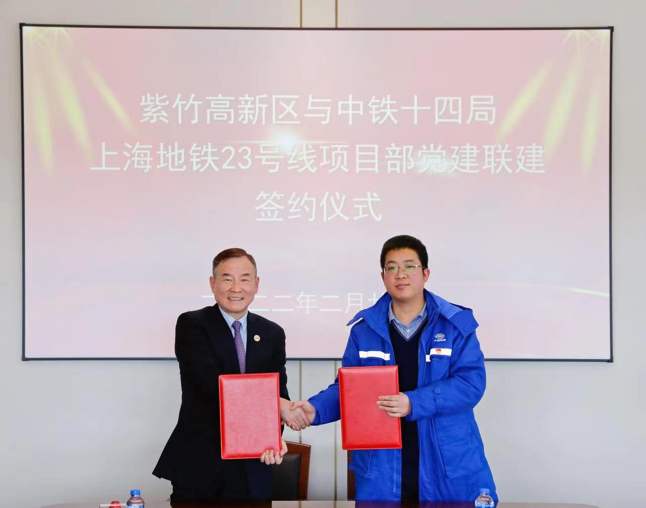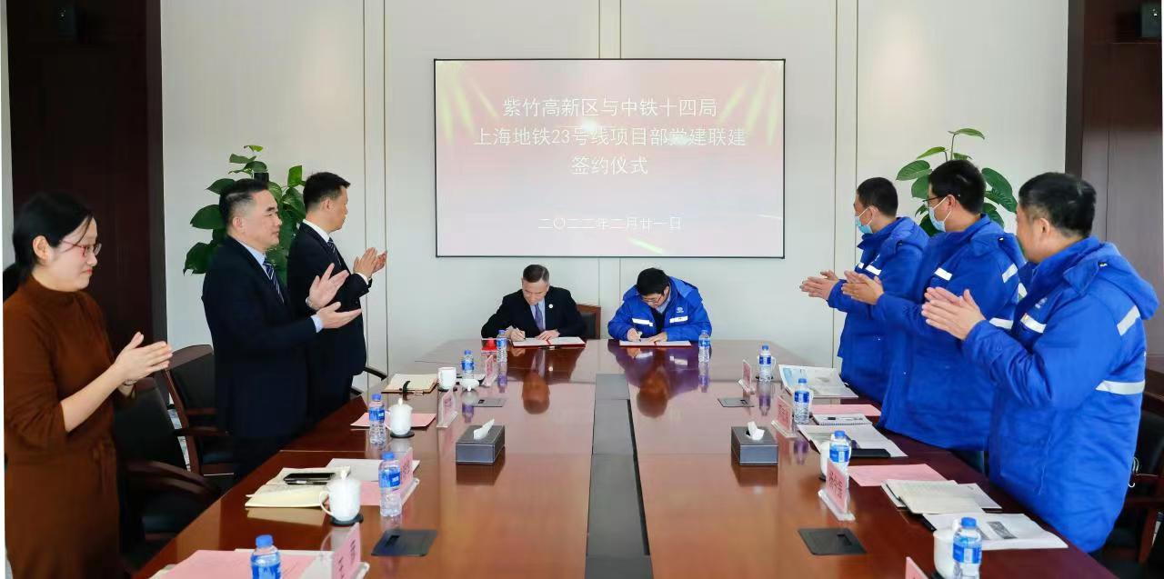 2022年2月21日上午,紫竹高新區黨委與地鐵23號線施工單位中鐵十四局項目部在高新區本部大樓簽訂黨建聯建協議。根據協議,在未來3年時間里,雙方通過黨建聯建,加強溝通,協調相關工作,以確保項目按進度高質量施工建設。