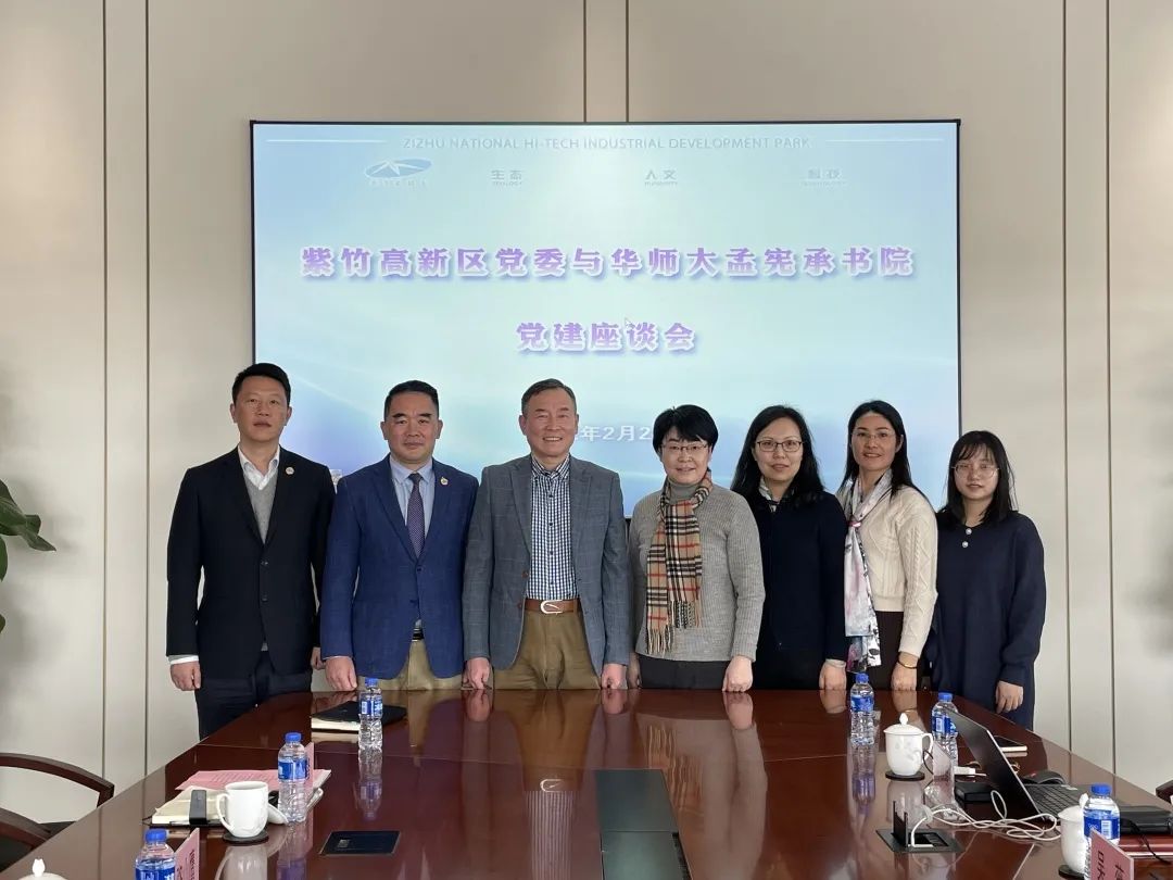 2月28日,紫竹高新區黨委與華師大孟憲承書院黨建座談會在紫竹高新區本部2樓4號會議室進行。紫竹高新區黨委書記、副總經理駱山鷹、副書記錢明華、黨辦主任王峰、副主任王彥,孟憲承書院黨委書記兼院長吳薇、副書記萬姍姍等出席本次座談會。會議由紫竹高新區黨委副書記錢明華主持。