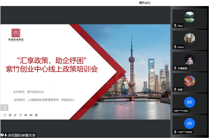 為進(jìn)一步助力科創(chuàng)企業(yè)克服疫情困難,精準(zhǔn)解讀政策并申報(bào)政府項(xiàng)目,2022年4月12日下午,紫竹創(chuàng)投組織舉辦了“匯享政策,助企紓困”線上政策培訓(xùn)分享會(huì)。本次活動(dòng)特邀上海市科委、經(jīng)信委中小企業(yè)服務(wù)專家湯侃磊為企業(yè)解讀抗疫政策及進(jìn)行雙創(chuàng)大賽賽前輔導(dǎo),活動(dòng)總計(jì)吸引了80余家紫竹科創(chuàng)企業(yè)觀看直播和在線交流。