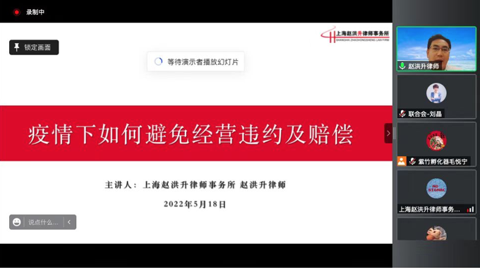 2022年5月18日下午,由紫竹孵化器、閔行區科技企業聯合會共同主辦的“2022年助企紓困、同心抗疫法律知識專題講座”成功舉辦。本次講座通過騰訊會議平臺進行,圍繞“疫情下如何避免經營違約及賠償”及“疫情期間企業快速回收款項的司法救濟”兩大主題,特邀請最高人民檢察院民事行政案件咨詢專家,在處理企業糾紛、爭議解決領域擁有多年執業經驗的趙洪升律師擔任主講嘉賓為30多家企業50余人開展線上法律專題分享。