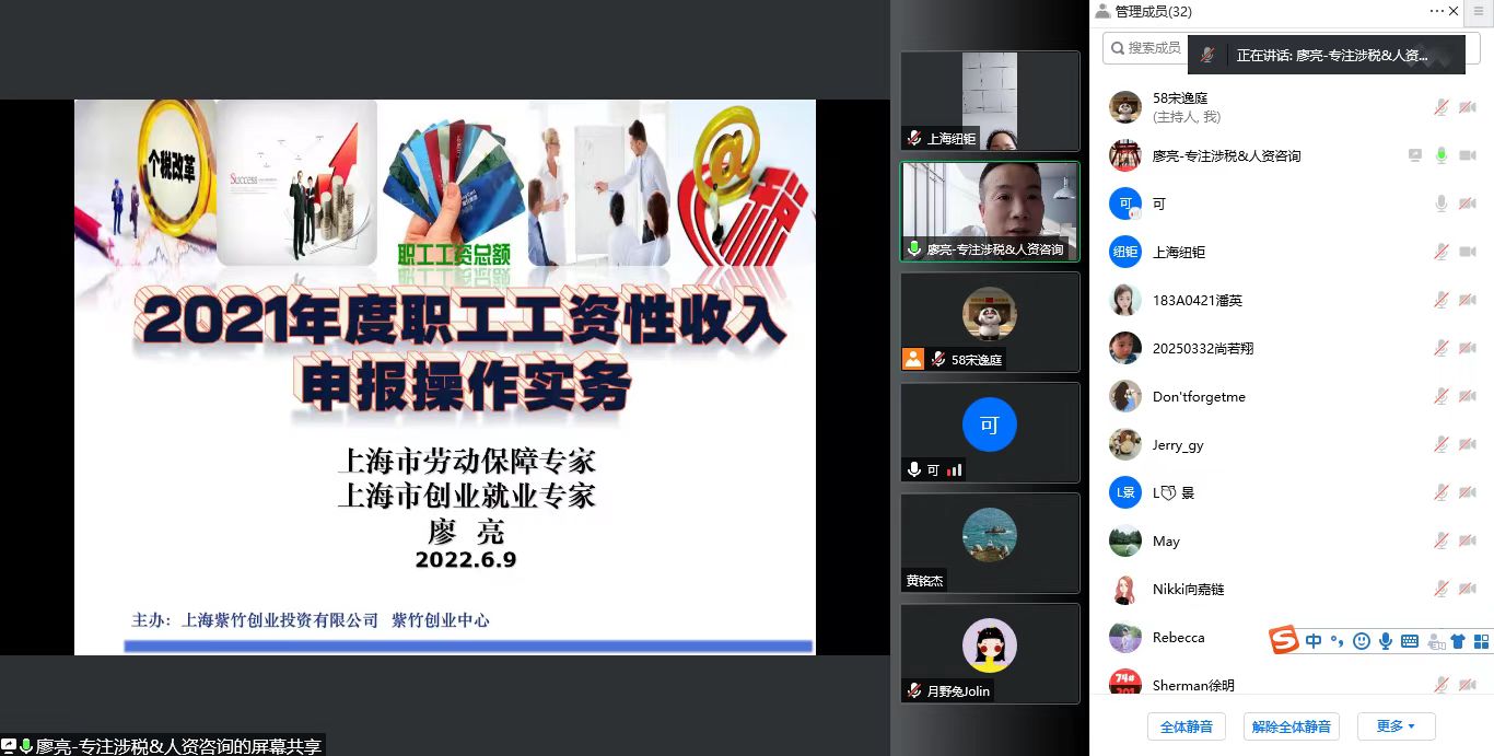 自2021年起,上海職工工資性收入申報(bào)工作正式啟動(dòng),并首次采用社保公積金合并申報(bào),為幫助企業(yè)做好此次新版填報(bào)工作,2022年6月9日下午,由上海市科委、閔行區(qū)就業(yè)促進(jìn)中心指導(dǎo),紫竹創(chuàng)投主辦的“職工工資性收入申報(bào)操作實(shí)務(wù)培訓(xùn)分享會(huì)”舉行,活動(dòng)特邀上海市創(chuàng)業(yè)就業(yè)專家廖亮,就今年工資性收入申報(bào)口徑解釋、申報(bào)操作指南、申報(bào)風(fēng)險(xiǎn)等進(jìn)行詳細(xì)指導(dǎo)與培訓(xùn),近50家紫竹創(chuàng)投在孵科創(chuàng)企業(yè)觀看直播和在線交流。