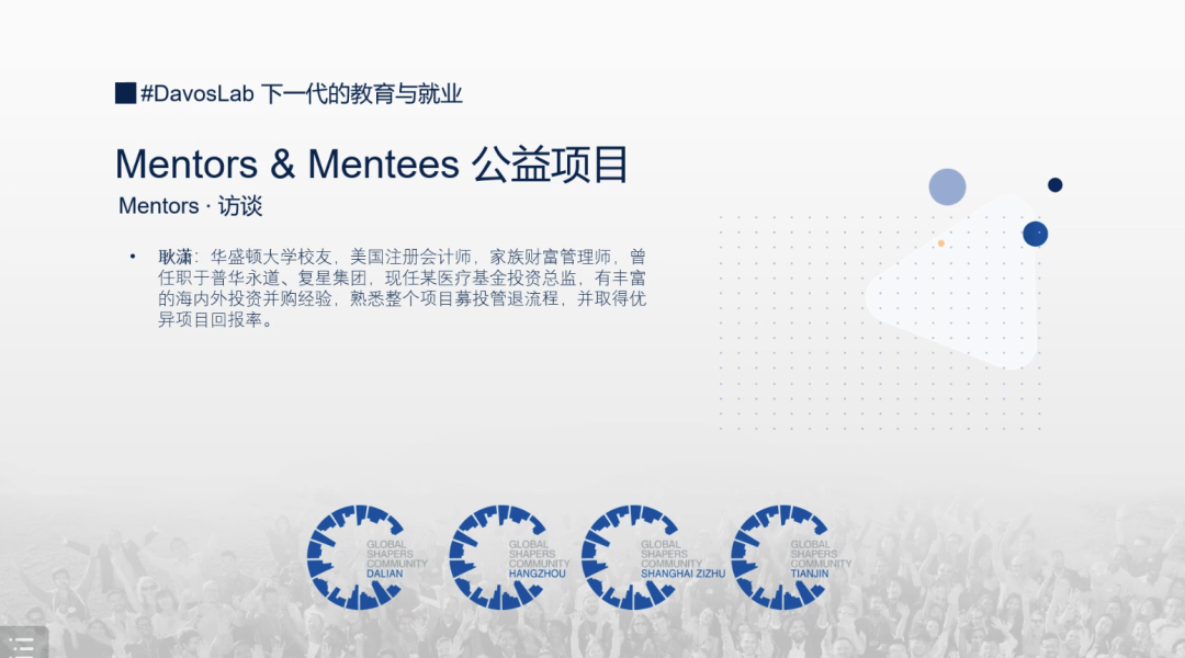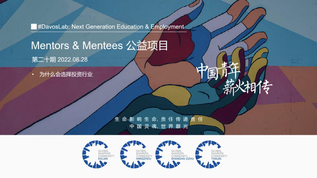 2022年8月28日晚,Mentors & Mentees 公益項目(中國青年 薪火相傳)第二十期在莘莘學子即將重新踏入校園之際,再一次在線上和大家見面。本期由紫竹杰青社區、大連社區、天津社區、杭州社區聯合主辦,邀請醫療領域資深投資總監耿瀟導師擔任分享嘉賓,與主持人舒晨曦一同就“為什么會選擇投資行業”主題和大家分享。
