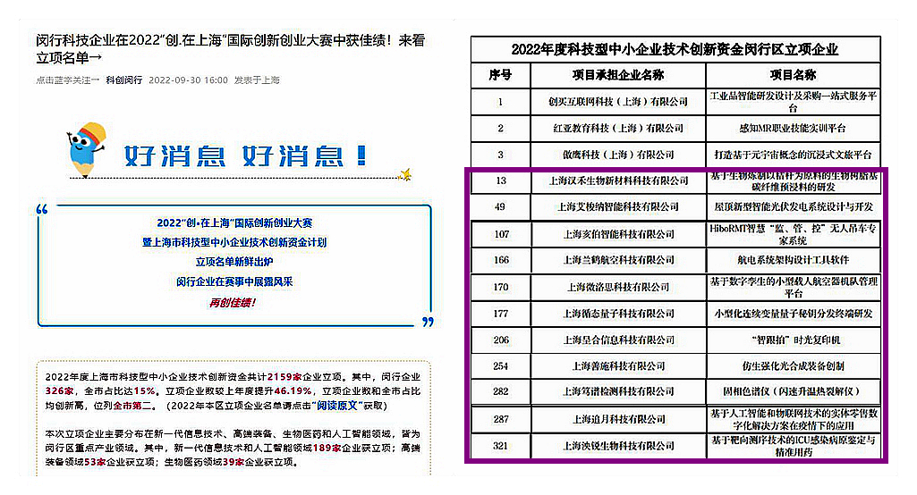 2022年9月29日,上海市科委正式公示了2022年“創·在上海”國際創新創業大賽立項名單,漢禾生物、善施科技、微洛思科技、呈合信息、追月科技、亥伯智能、泱銳生物、艾梭納智能、篤譜檢測、蘭鶴航空、循態信息等11家紫竹創業孵化器優秀入駐企業從眾多參賽項目中脫穎而出,獲得大賽立項,彰顯紫竹創業孵化器優質的孵化服務能力。