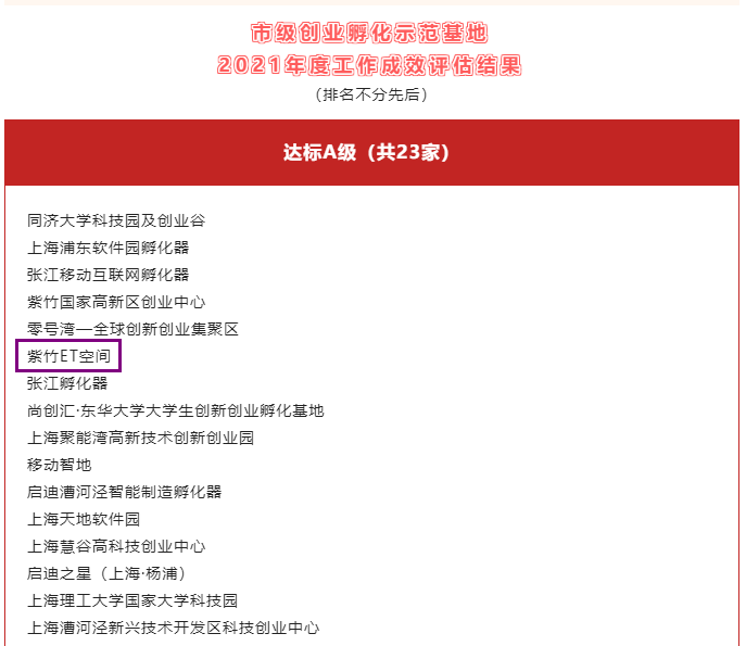 近日,上海市人社局市級創(chuàng)業(yè)孵化示范基地2021年度工作成效評估結(jié)果正式公布,紫竹ET空間以優(yōu)異的孵化業(yè)績在本次考核評估中名列前茅,位列眾創(chuàng)空間組全市第一,連續(xù)四年榮獲市級創(chuàng)業(yè)孵化示范基地A級園區(qū)稱號,同時也是閔行區(qū)唯一一家連續(xù)四年獲得A類評定的眾創(chuàng)空間,彰顯紫竹科創(chuàng)服務(wù)實力。