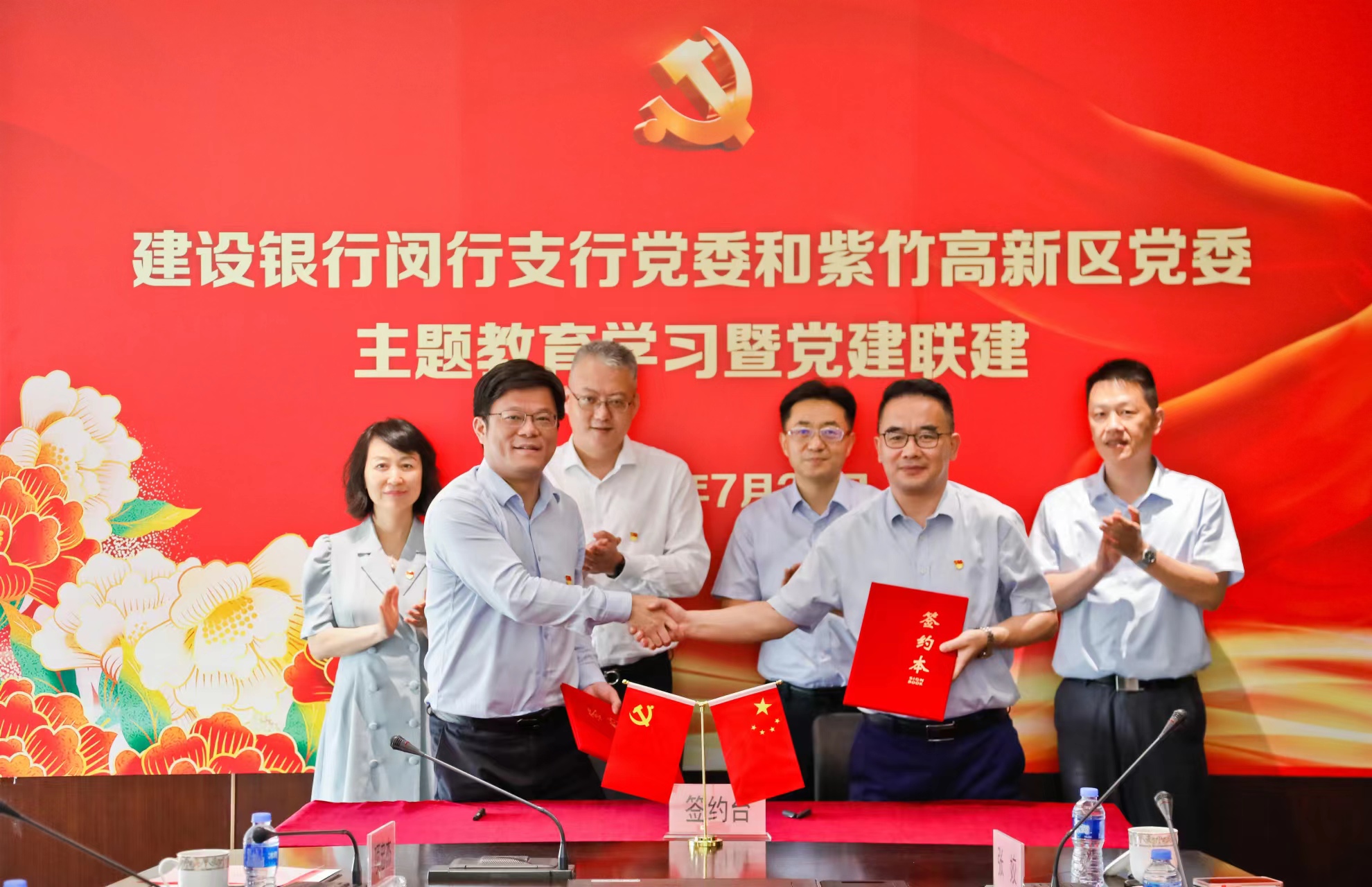 2023年7月26日下午,紫竹高新區黨委與建行閔行支行黨委開展黨建聯建。雙方交流學習了習近平新時代中國特色社會主義思想主題教育的心得體會,表示學習重在落實,要將主題教育的精神轉化為進一步推動工作上臺階的動力,在黨建服務經濟,金融支持科技進步等方面邁出新步伐,取得了新業績。建行上海分行副行長周濤,分行投資銀行部總經理朱道弘,分行科技金融創新中心副總經理樓慈芳,閔行支行黨委書記、行長劉瀛,以及紫竹高新區副總經理陳衡、黨委副書記錢明華、財務中心執行總監蔡光平、黨委辦公室主任王峰等出席黨建共建活動。