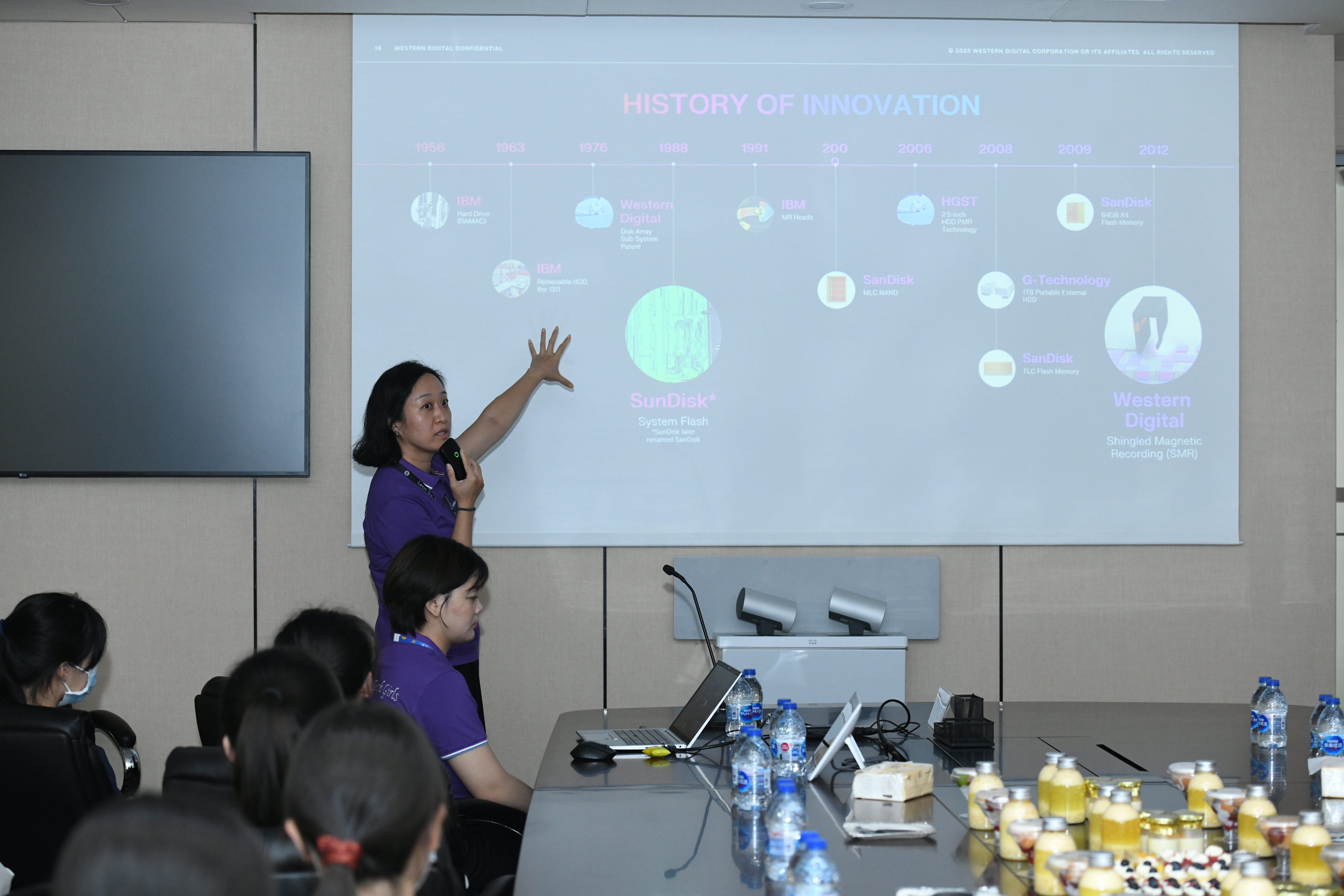 活動第二部分,夏令營特邀公司的卓越運營總監張曉娜為大家作分享。她通過公司幾十年來發展歷程以及晟碟半導體公司致力于推動先進工業4.0技術的全方位實踐,憑借在可持續發展領域的突破性成果,榮獲中國首家“可持續發展燈塔工廠”稱號的介紹引入對國際視野、創新發展的見解,講述未來科技發展的方向和可行性,為高中生們拓展了視野。產品研發總監張宇飛以自己的職業成就及工作經驗出發,為女高生們講述了女生職業選擇的幾種觀點,引導她們明白職業發展過程中也要不斷學習新知識和新技能 。張總監表示,當今社會女性受教育程度進一步提高,女性對自身束縛也不斷打破,正面對高科技領域職場中的機遇和調整,女性也可以自由選擇在高科技領域發光發熱。