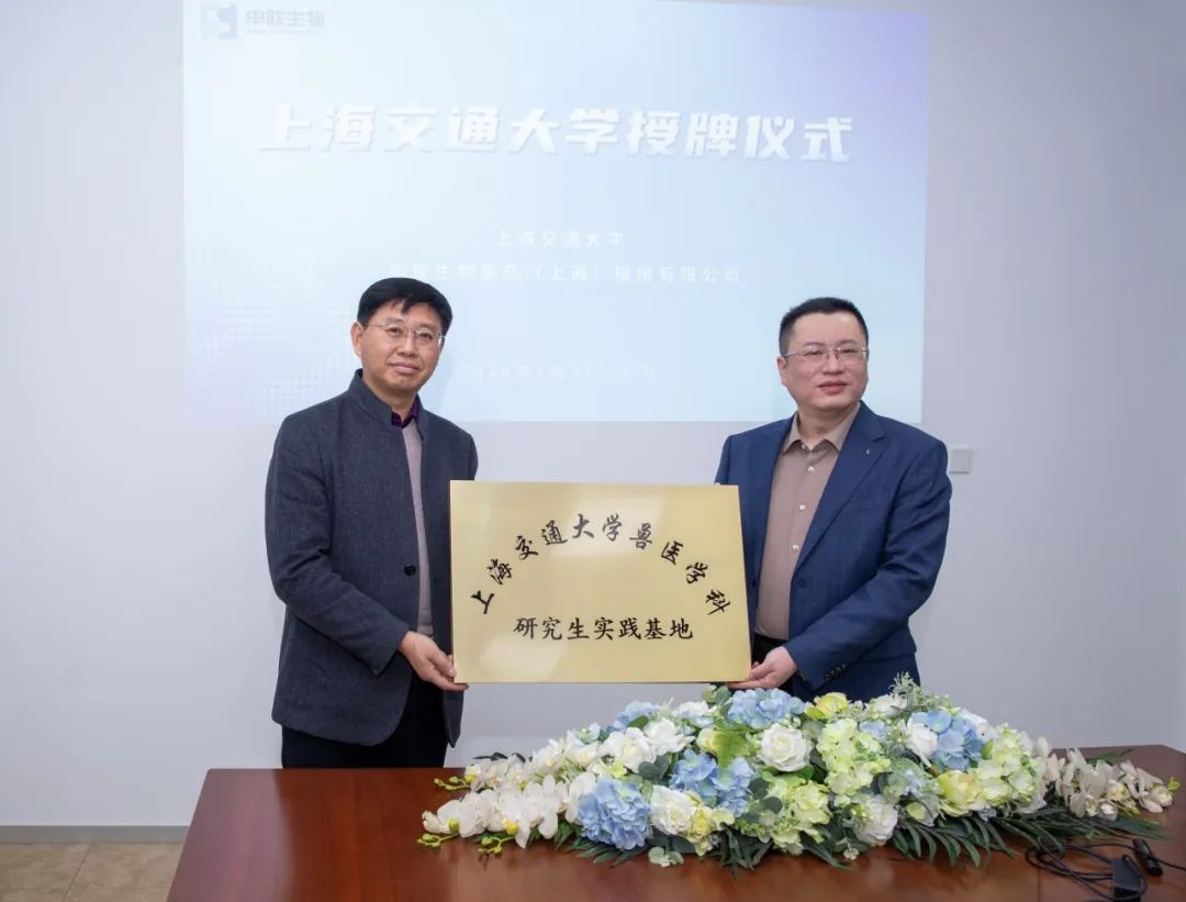2024年1月9日,申聯(lián)生物醫(yī)藥(上海)股份有限公司與上海交通大學(xué)“上海交通大學(xué)獸醫(yī)學(xué)科研究生實踐基地”的授牌儀式在申聯(lián)生物舉行。上海交大農(nóng)業(yè)與生物學(xué)院副院長李新紅、動科系主任袁聰俐、動科系長聘教授孫建和,以及申聯(lián)生物常務(wù)副總經(jīng)理張震、研發(fā)中心主任馬貴軍博士、人力資源總監(jiān)王蕾、技術(shù)總監(jiān)殷波博士等參加本次儀式。