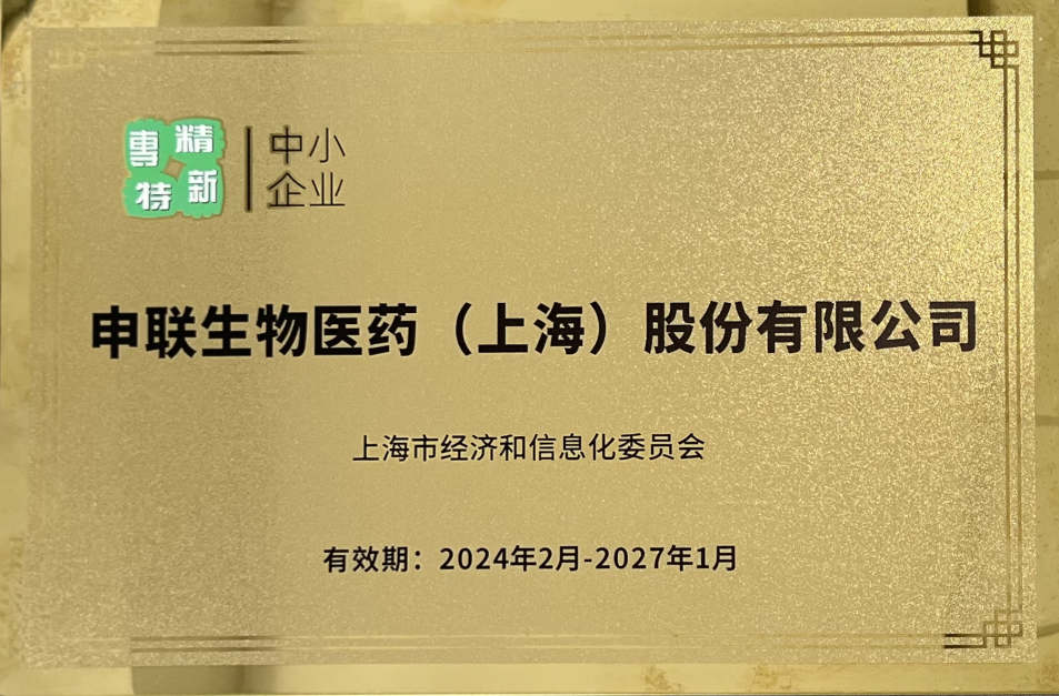 近日,申聯生物獲得由上海市經濟和信息化委員會頒發的“上海市專精特新中小企業”銘牌。這是公司繼2018年首次通過該項認定后,順利通過復核再度獲得此項榮譽。