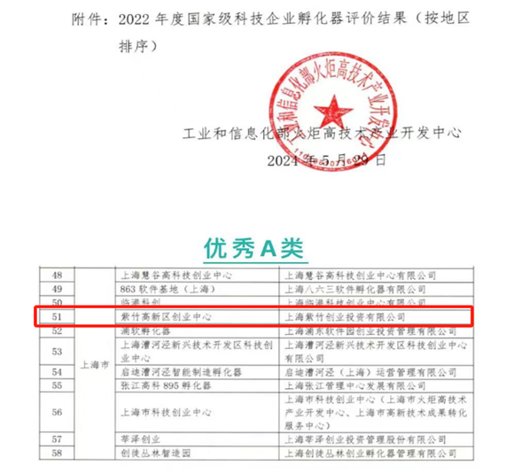 近日,工信部火炬中心發布了《關于公布2022年度國家級科技企業孵化器評價結果的通知》,上海紫竹創業投資有限公司(孵化基地名稱:上海紫竹高新區創業中心)榮獲年度評價考核A類等第,這也是紫竹創投第二次榮獲火炬中心孵化器年度評價A類等第,本次評價全國國家級孵化器A類等第比例為20%,上海市全市共有12家國家級孵化器獲評A類,紫竹創投評價綜合成績位于上海市前列。
