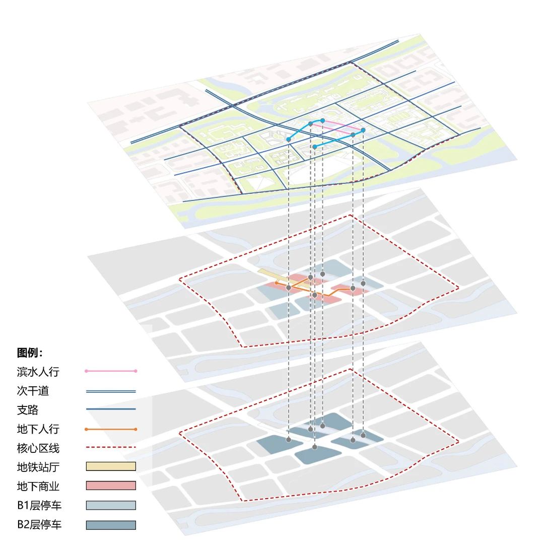 加強核心區軌交站點周邊地下空間一體化開發,采用地上、地面、地下互聯互通的立體開發模式。立體慢行系統利用二層連廊、濱水步道與地下連通道,實現地塊間的無車化慢行連通;地下空間通過綜合交通樞紐聯通地鐵站點、周邊商業、停車等設施,重復利用地鐵人流走向,實現路徑與空間的無縫銜接;提高軌交站點步行可達性,加強站點與公共服務設施及濱江綠地的步行聯系。