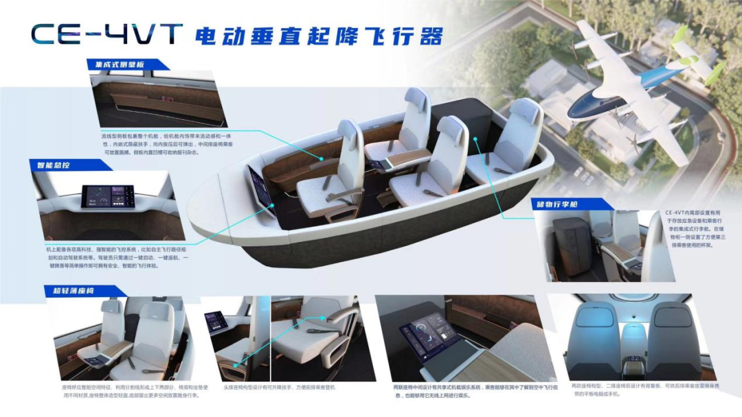 CE-4VT的氣動外形將流線美學與完美功能性融合的淋漓盡致,簡約流暢的線條運用讓空間感更為突出,將設計美學、人體工學和可持續發展的理念融為一體,創造一個能喚起安全感、舒適感和創新感的乘坐環境,讓乘客在旅途中感受輕松和新奇,確保每個細節的精心設計都能為乘客帶來卓越舒心的飛行體驗。